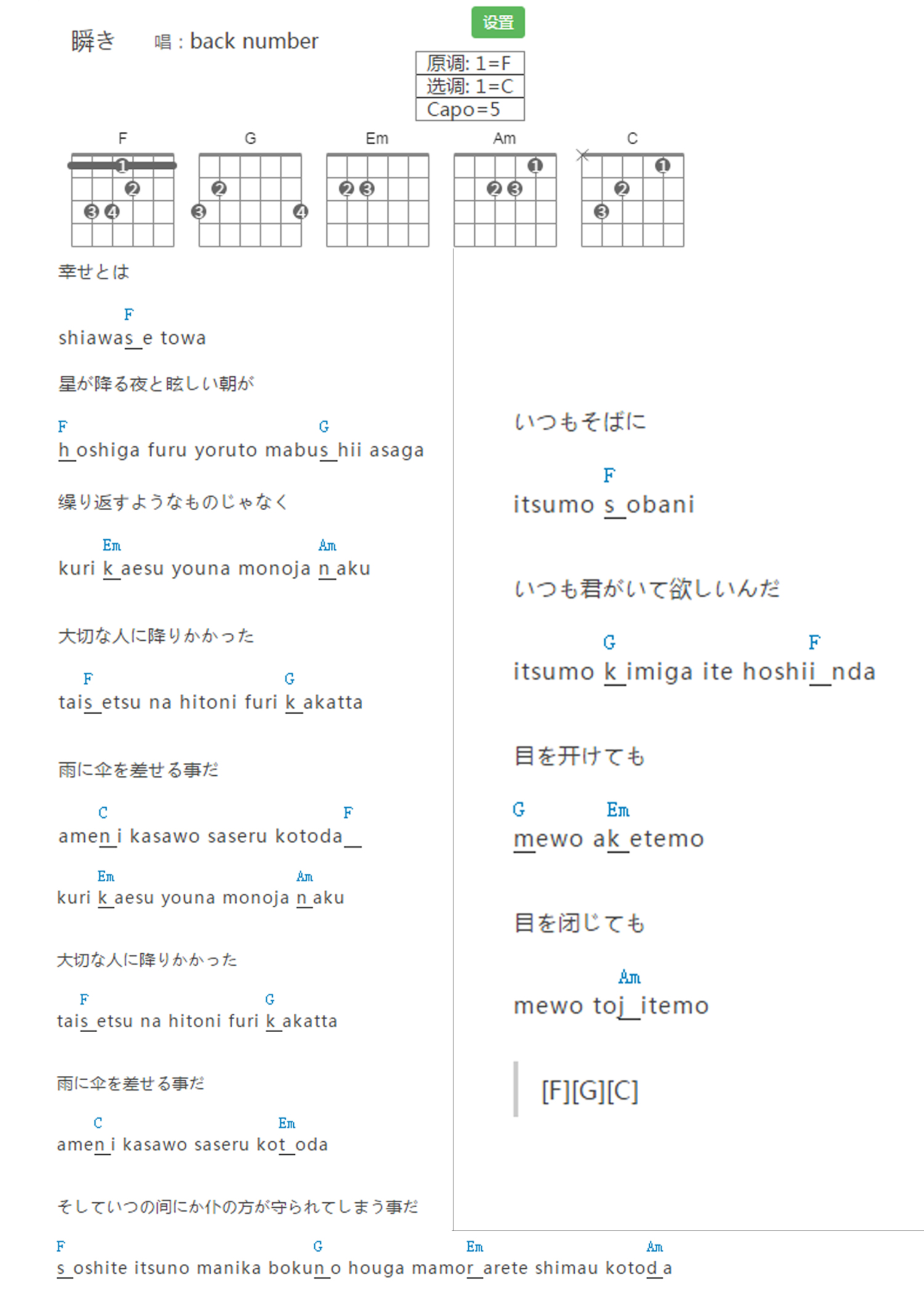 瞬き吉他谱 - back number - C调吉他弹唱谱