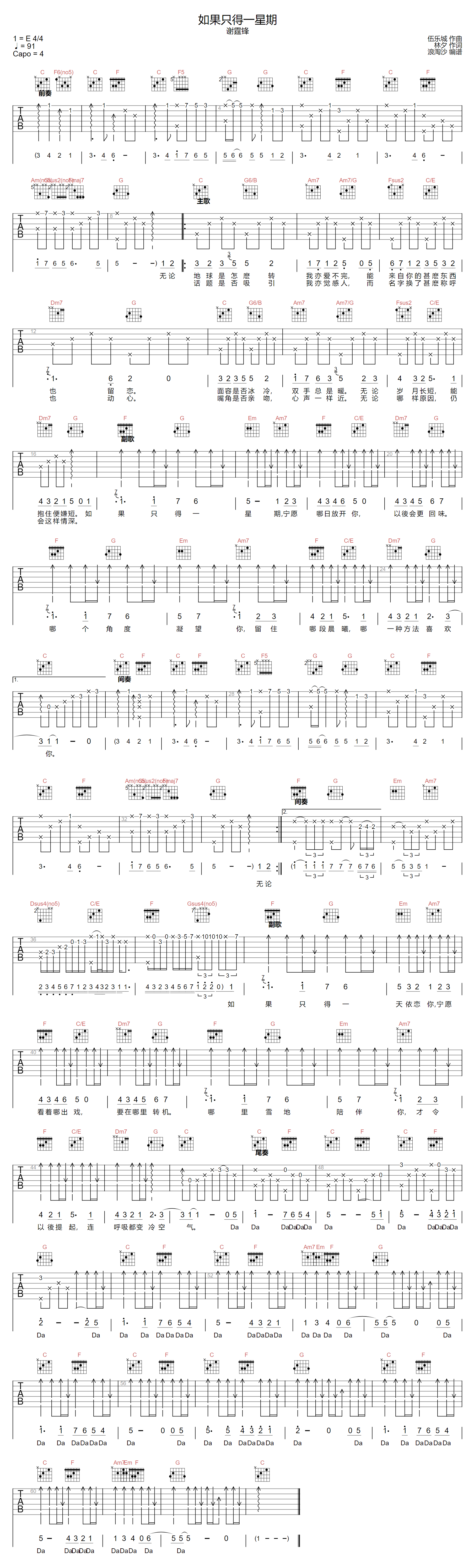 曲谱介绍: 谢霆锋演唱的一首歌曲,4/4拍的节奏,这首歌曲的原调为E调,这里曲谱采用了C调指法进行编配,演唱时夹变调夹4品可回到原调,也可根据个人实际嗓音情况选择。曲谱由琴谱网更新上传,来源于@浪淘沙编配出品。“如果只得一星期,宁愿那日放开你,以后会更回味,哪个角度凝望你,留住那段晨曦,哪一种方法喜欢你,无论话题是否吸引,我亦觉感人。”