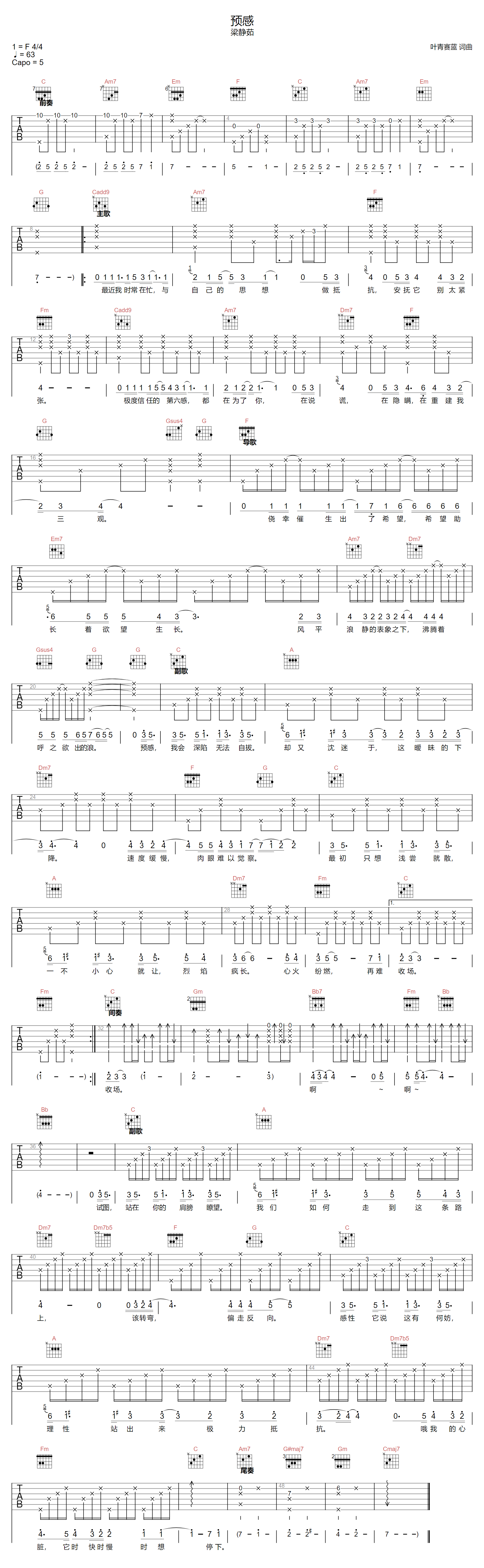 曲谱介绍: 梁静茹演唱的一首歌曲,4/4拍的节奏,这首歌曲的原调为F调,这里曲谱采用了C调指法进行编配,演唱时夹变调夹5品可回到原调,也可根据个人实际嗓音情况选择。曲谱由琴谱网更新上传,曲谱来源于网络转载,编配制谱者暂不详。这是梁静茹新专辑里的一首情歌,唱得人心都在跟着颤动,即将沦陷在一段不可得的爱里面,感性和理性在对抗,娓娓道来,叙事感极强。