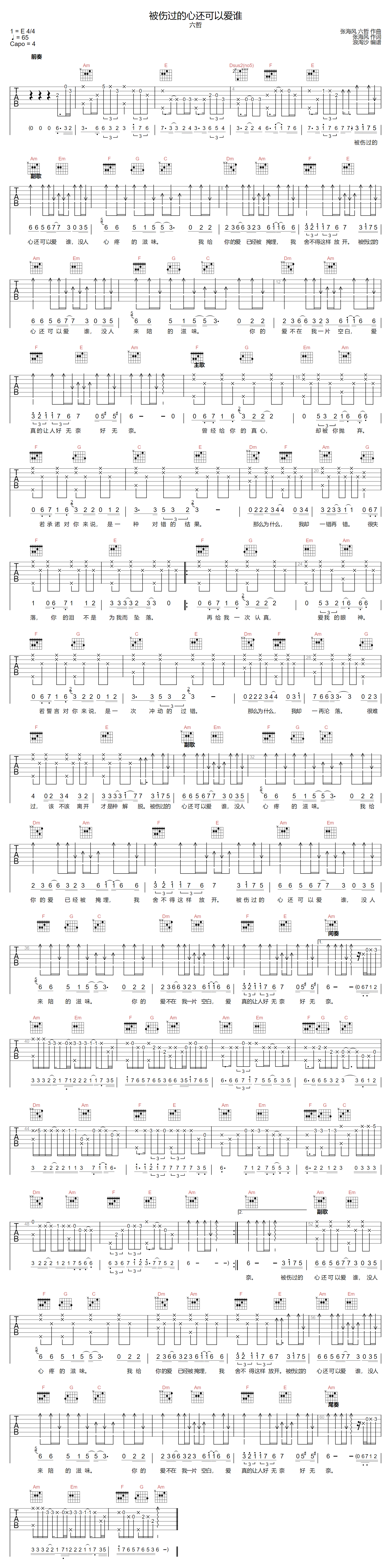 曲谱介绍: 六哲演唱的一首歌曲,4/4拍的节奏,这首歌曲的原调为E调,这里曲谱采用了C调指法进行编配,演唱时夹变调夹4品可回到原调,也可根据个人实际嗓音情况选择。曲谱由琴谱网更新上传,来源于@浪淘沙编配出品。这首伤感情歌,是六哲为了怀念以前的一段爱情而创作的,他那干净而富有磁性的歌曲将这首歌所表达的感情演绎得淋漓尽致。