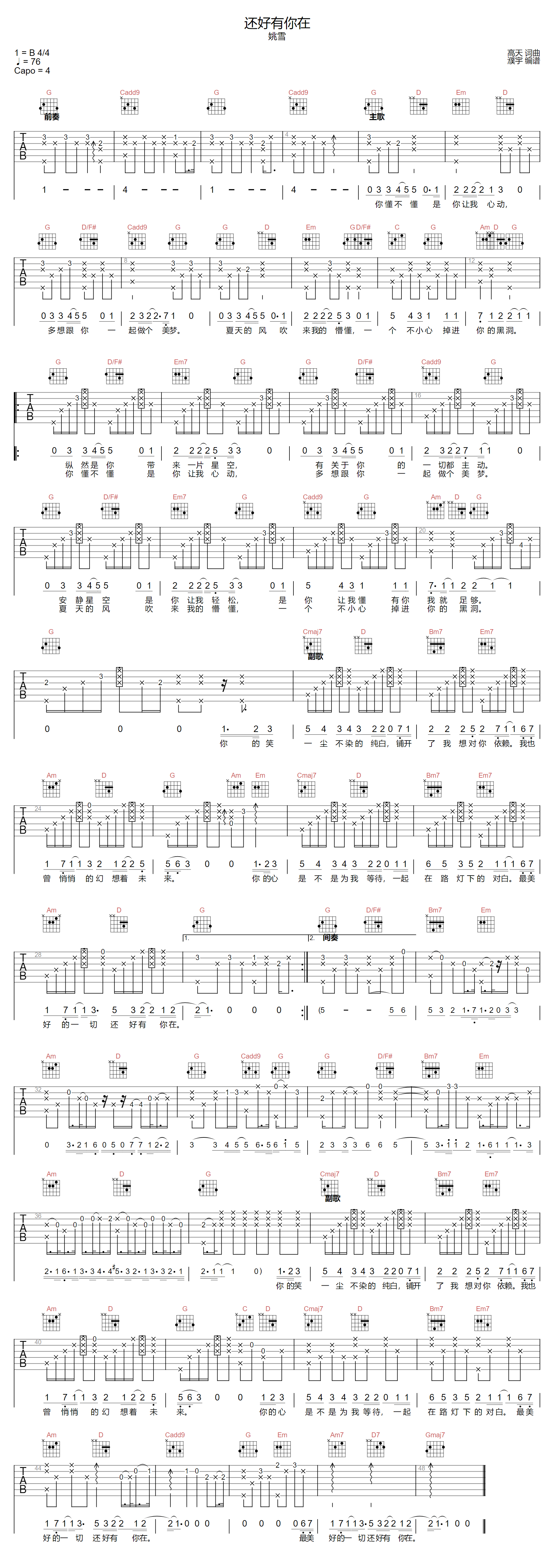 曲谱介绍: 姚雪演唱的一首歌曲,4/4拍的节奏,这首歌曲的原调为B调,这里曲谱采用了G调指法进行编配,演唱时夹变调夹4品可回到原调,也可根据个人实际嗓音情况选择。曲谱由琴谱网更新上传,来源于@濮宇编配出品。主歌简单节制内敛的钢琴持续到华丽的弦乐,而后带出极具记忆度的“还好有你在”副歌动机,恢弘气势使得这首作品更加大气。