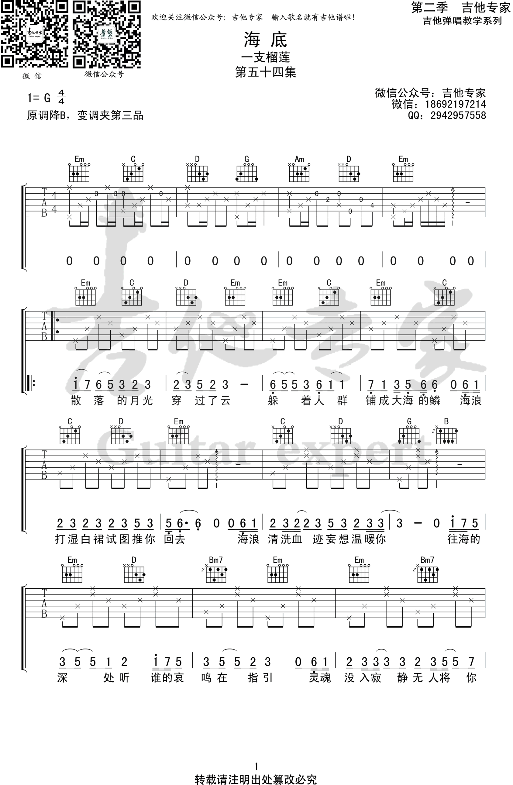 曲谱介绍: 一支榴莲演唱的一首歌曲,4/4拍的节奏,这首歌曲的原调为降B调,这里曲谱采用了G调指法进行编配,演唱时夹变调夹3品可回到原调,也可根据个人实际嗓音情况选择。曲谱由琴谱网更新上传,来源于@吉他专家编配出品。这首歌据说是写给抑郁症患者的歌,缓慢忧伤的旋律搭配一支榴莲轻轻柔柔极具个性的嗓音,仿佛满满坠入海底,背后的故事也是渗透着忧伤,让听者深深触动。