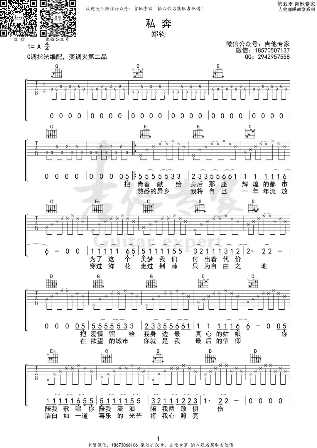 私奔吉他谱 - 郑钧 - G调吉他弹唱谱 - 原版