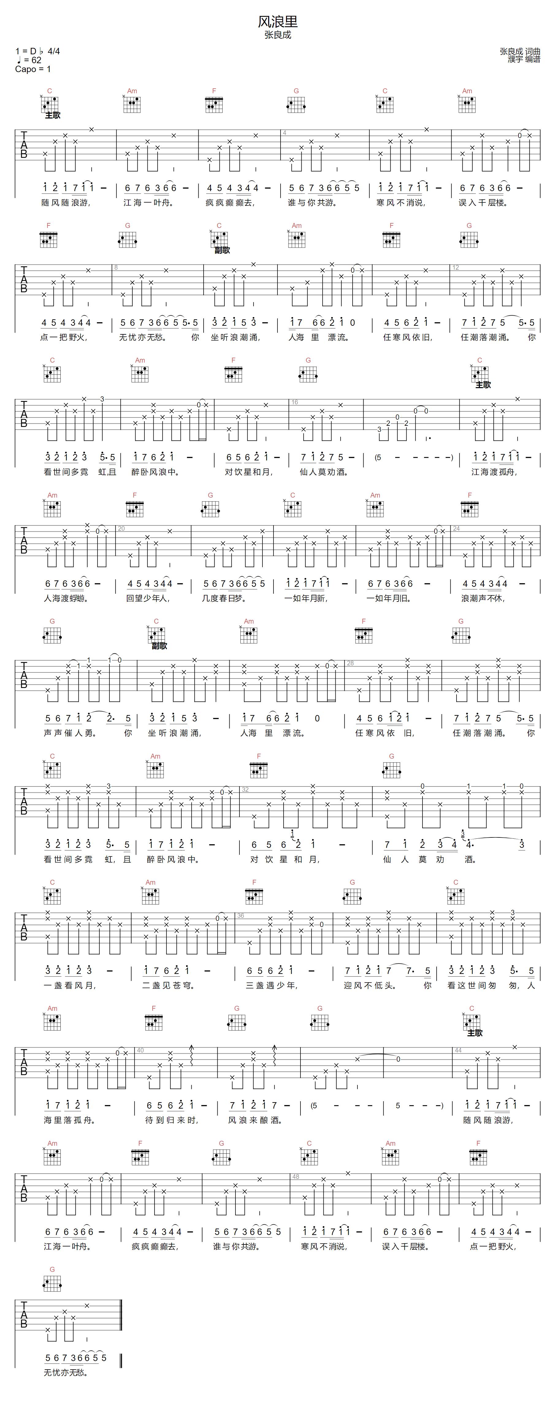 风浪里吉他谱 - 张良成 - C调吉他弹唱谱 - 原版