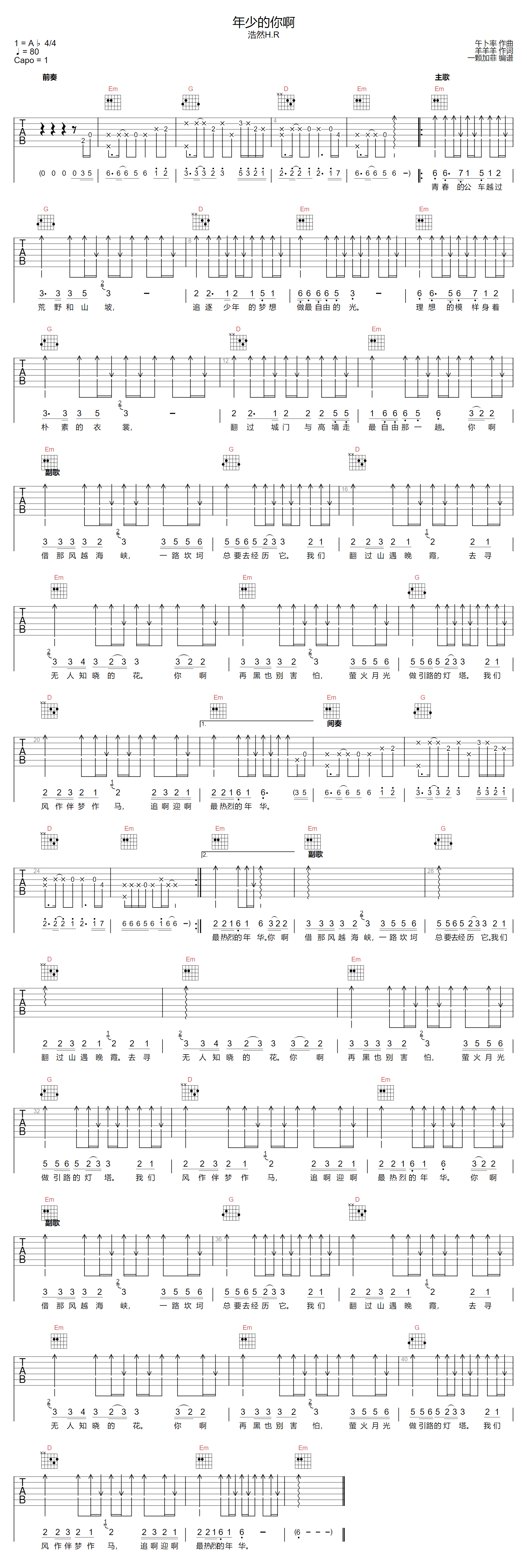 年少的你啊吉他谱 - 浩然H.R - G调吉他弹唱谱