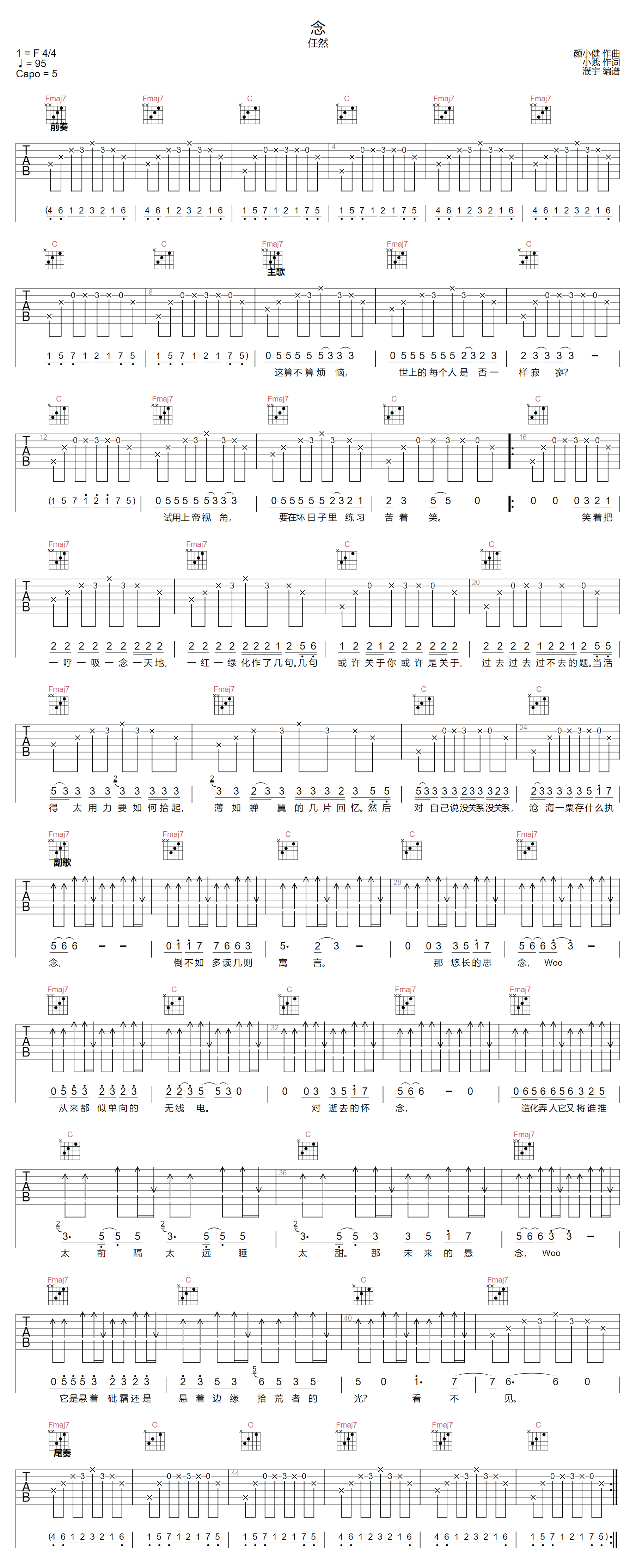 曲谱介绍: 任然演唱的一首歌曲,4/4拍的节奏,这首歌曲的原调为F调,这里曲谱采用了C调指法进行编配,演唱时夹变调夹5品可回到原调,也可根据个人实际嗓音情况选择。曲谱由琴谱网更新上传,来源于@濮宇编配出品。与此前的歌不同,《念》是一首回顾从前,感悟生活与情感的歌曲,既有放下执念的坦然,也有云淡风轻的豁达;既有虚度年华,空有一身疲惫的感慨,也有世间草木皆美的期许。