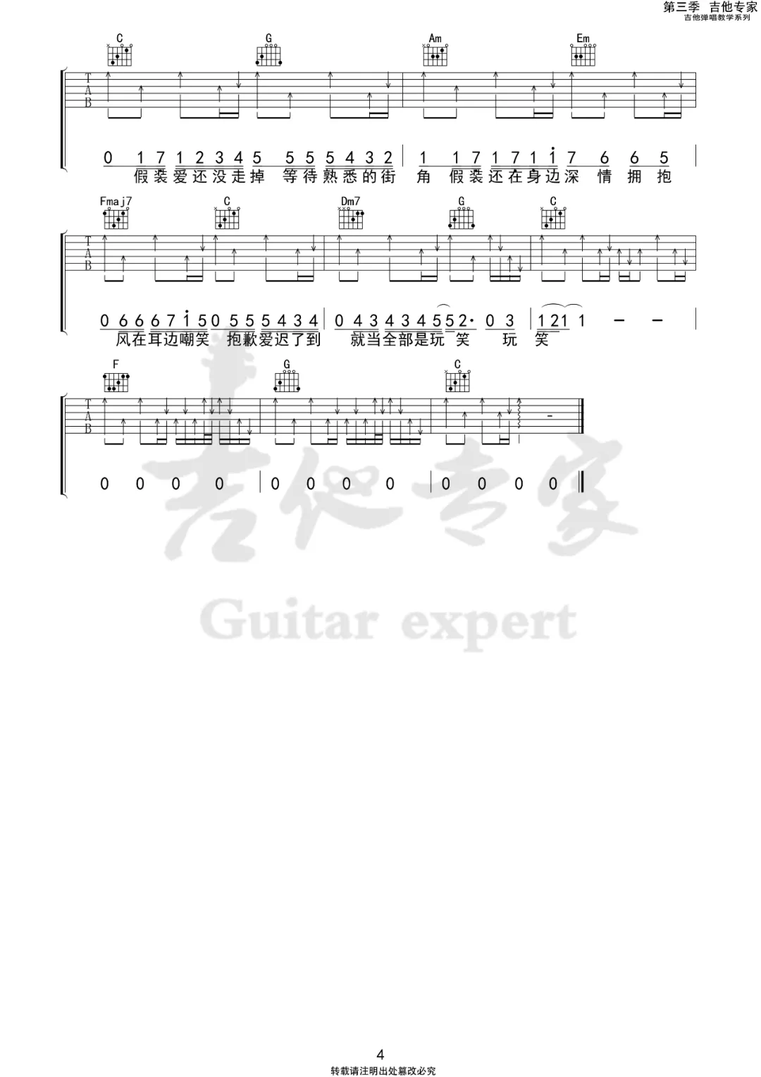曲谱介绍: 刘大壮演唱的一首歌曲,4/4拍的节奏,这首歌曲的原调为降E调,这里曲谱采用了C调指法进行编配,演唱时夹变调夹3品可回到原调,也可根据个人实际嗓音情况选择。曲谱由琴谱网更新上传,来源于@吉他专家编配出品。其实所有纠结于过去的人,心里早就有了答案,只是假装自己还没得到答案。安全感,回忆,感觉相加在一起,假装TA还在身边,假装一切都能回到原点2021年的初夏,假装你还没走掉,假装你还对我好。
