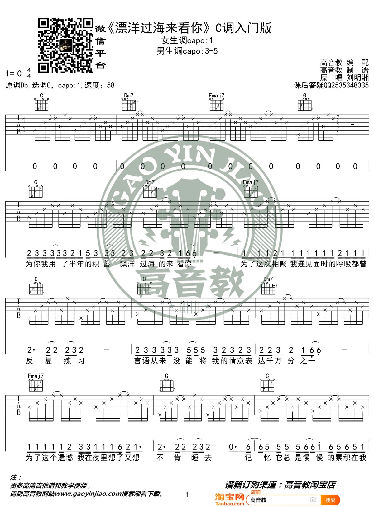 漂洋过海来看你吉他谱 - 刘明湘 - C调吉他弹唱谱