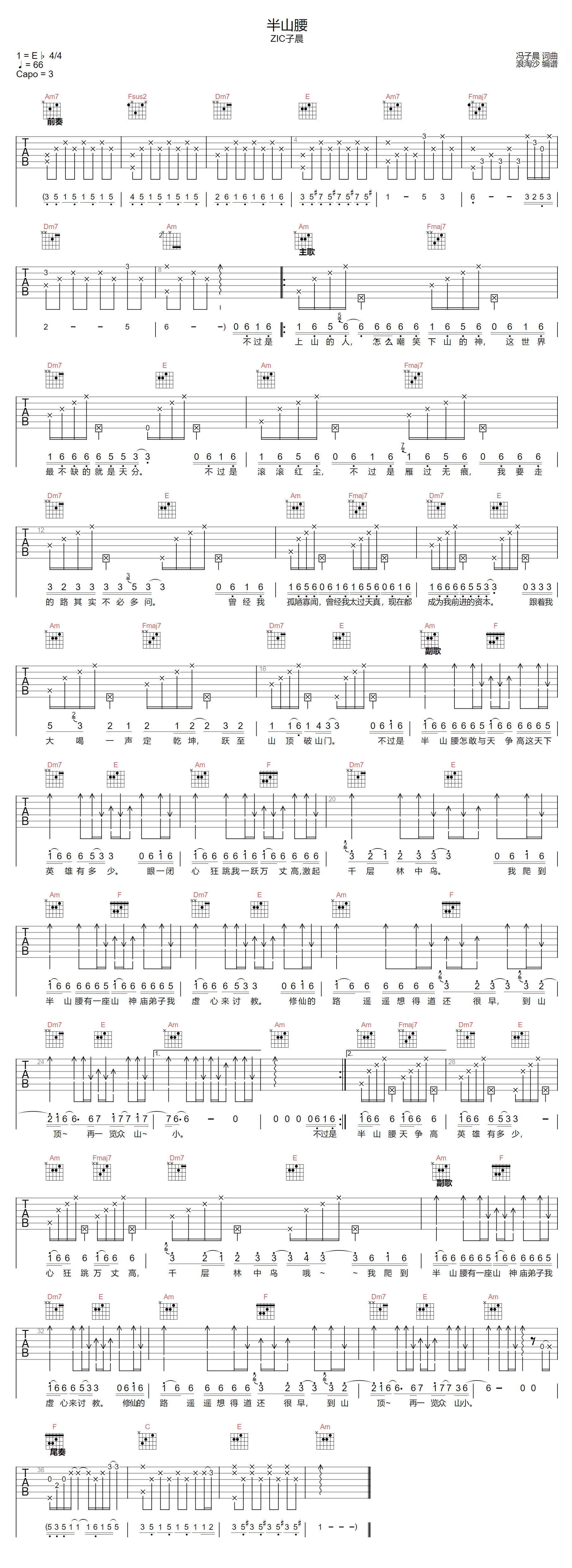 曲谱介绍: ZIC子晨演唱的一首歌曲,4/4拍的节奏,这首歌曲的原调为降E调,这里曲谱采用了C调指法进行编配,演唱时夹变调夹3品可回到原调,也可根据个人实际嗓音情况选择。曲谱由琴谱网更新上传,来源于@浪淘沙编配出品。人生之路,道阻且长,保持敬畏之心,怀揣赤子之热,一步一个脚印,别被无知困在了,“半山腰”,去攀登属于自己的最高峰吧,去与天公试比高!