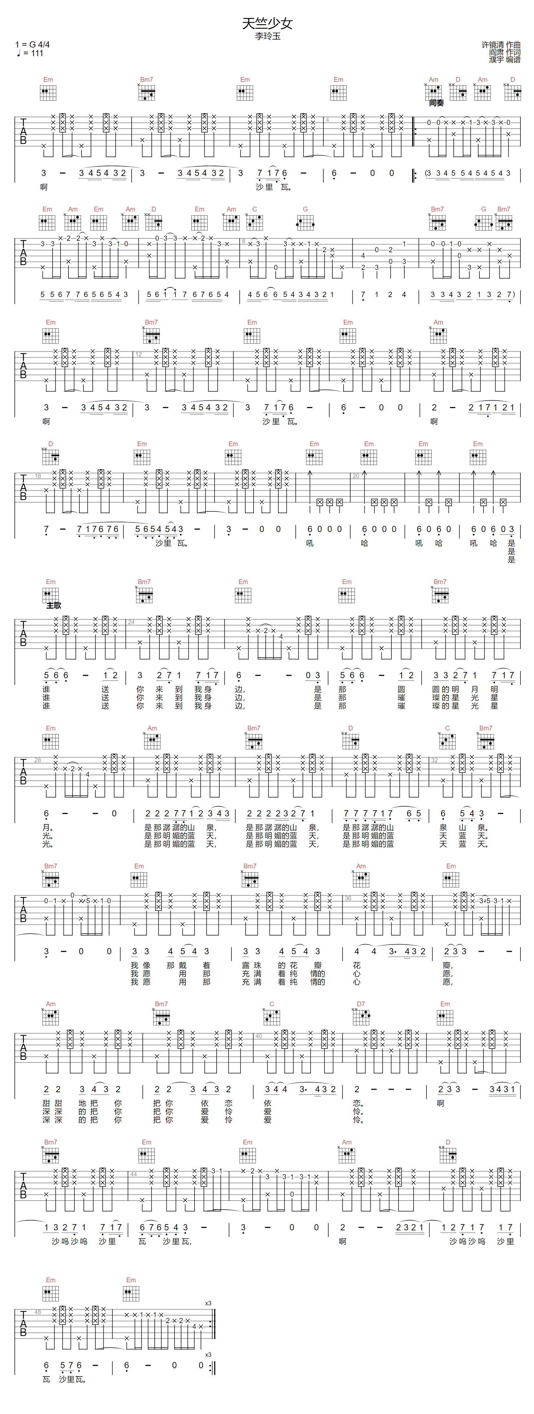 天竺少女吉他谱 - 李玲玉 - G调吉他弹唱谱 - 原版