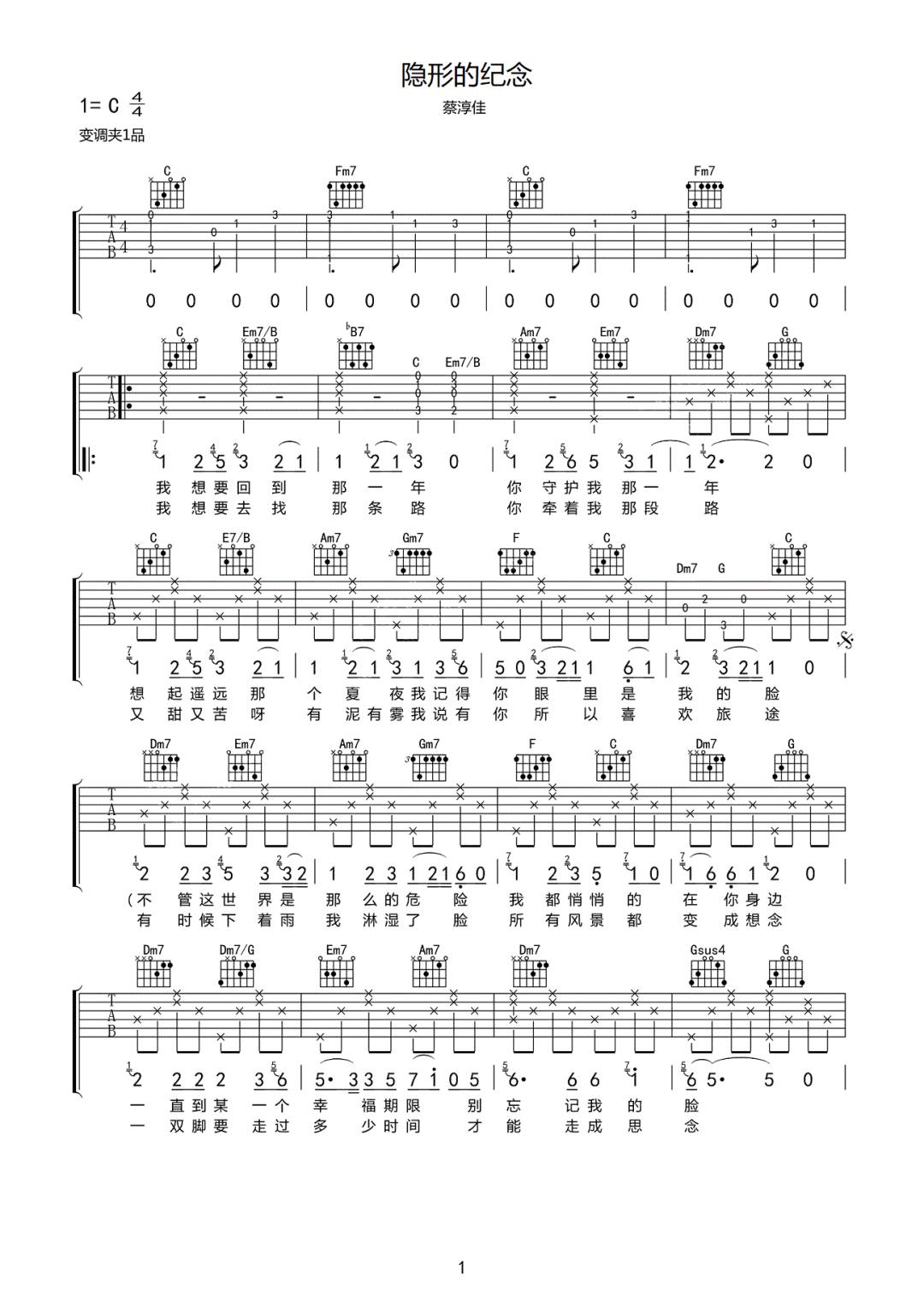 隐形的纪念吉他谱 - 蔡淳佳 - C调吉他弹唱谱 - 原版