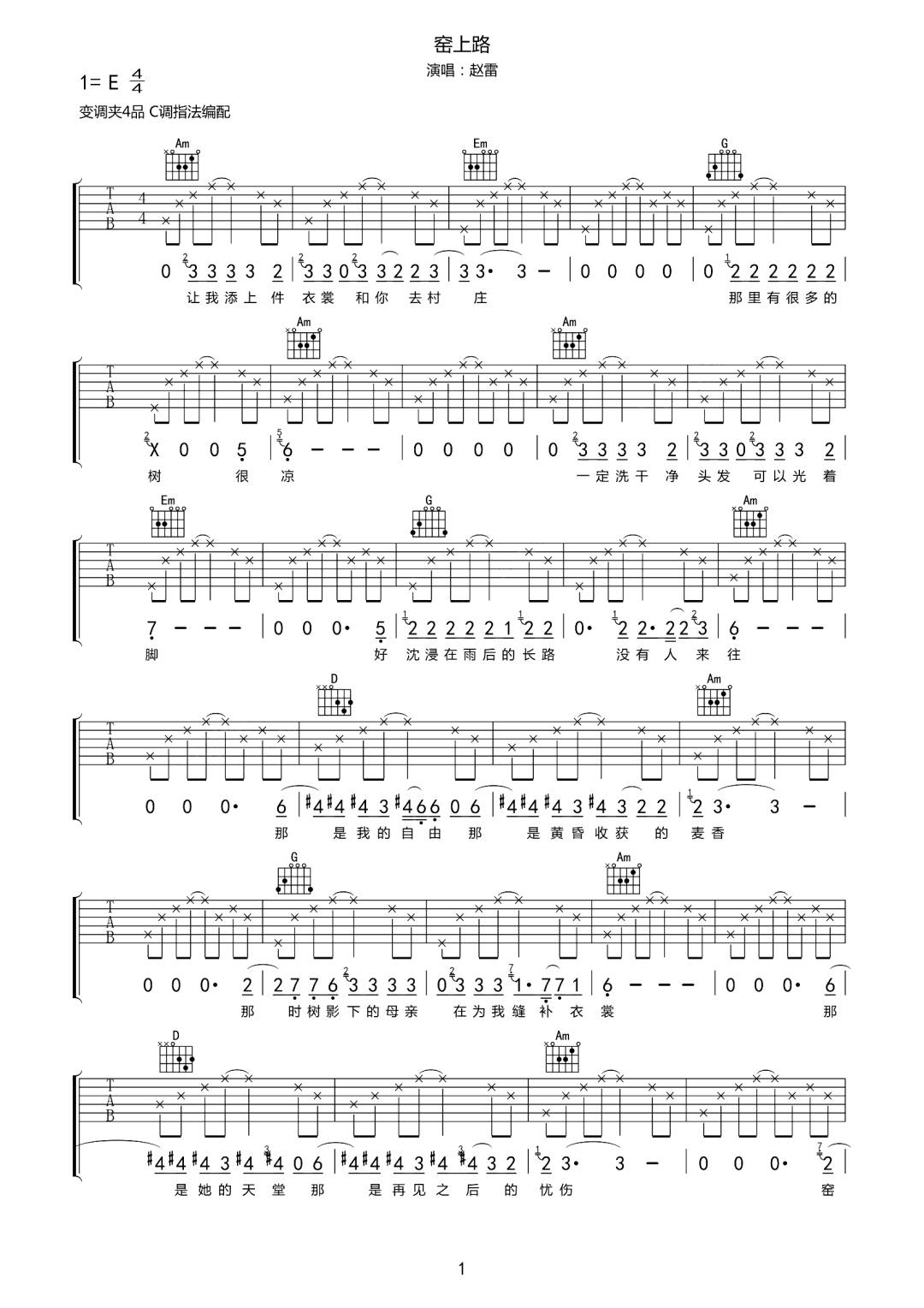 窑上路吉他谱 - 赵雷 - C调吉他弹唱谱