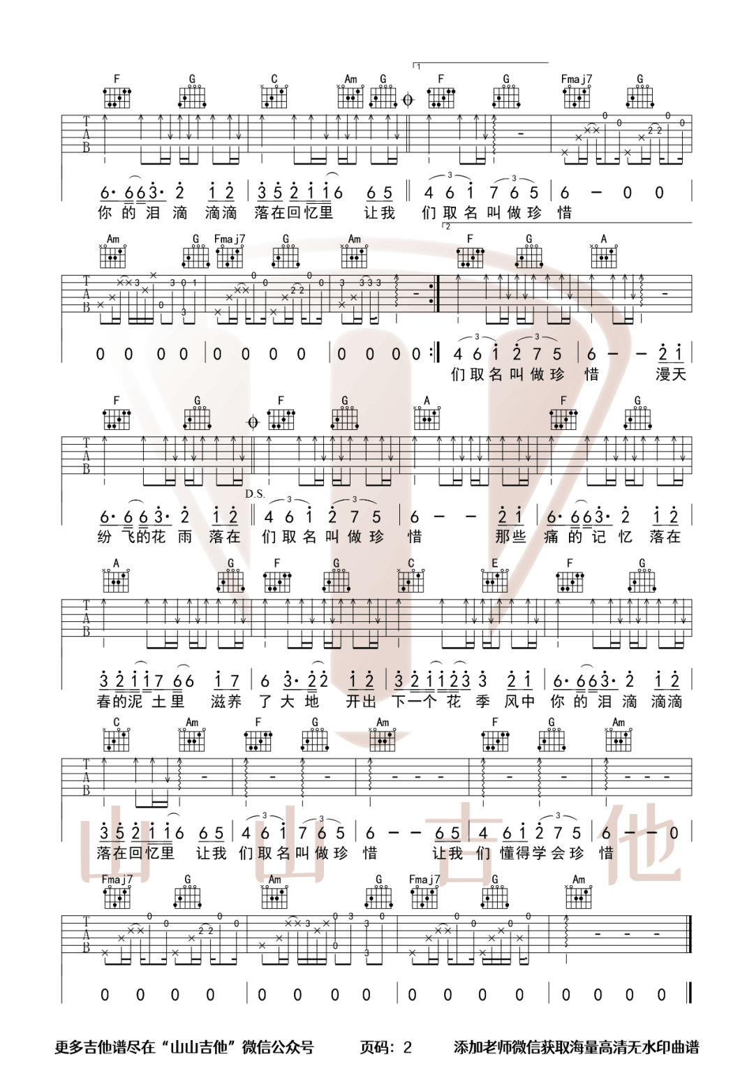 曲谱介绍: 庾澄庆演唱的一首歌曲,4/4拍的节奏,这首歌曲的原调为C调,这里曲谱采用了C调指法进行编配,演唱时可不夹变调夹,曲谱由琴谱网更新上传,来源于@山山吉他编配出品。庾澄庆在演唱这首歌曲的时候,并不想以悲伤的唱腔来表达,反而是用淡淡像是吟唱诗句般的感觉,把不放弃爱情的希望唱了出来。
