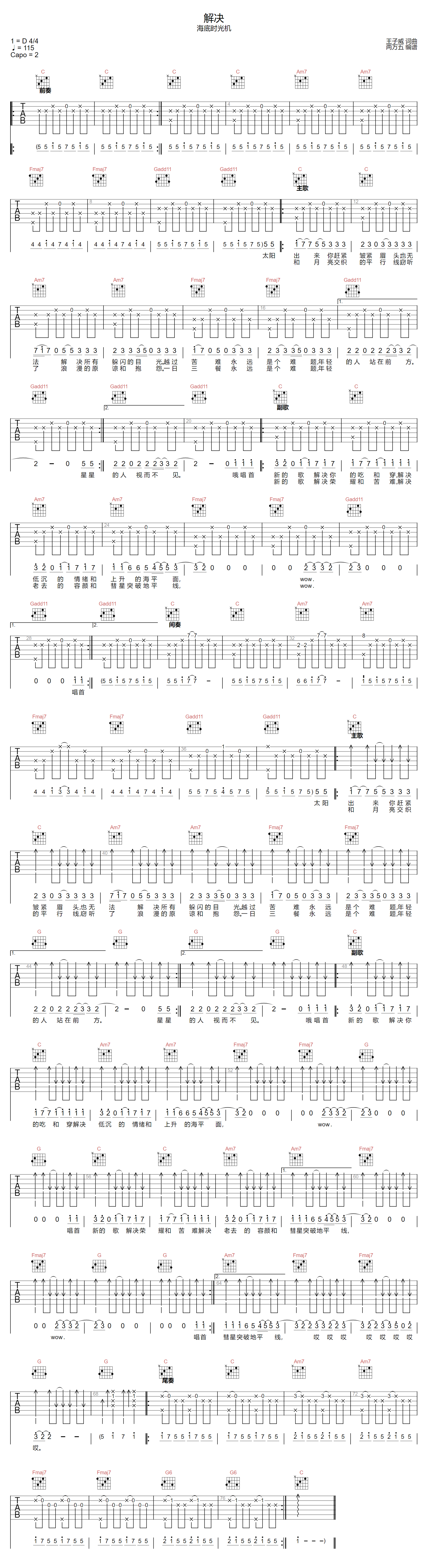 解决吉他谱 - 海底时光机 - C调吉他弹唱谱 - 原版