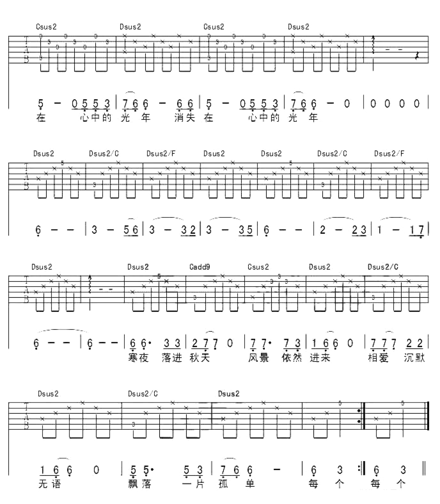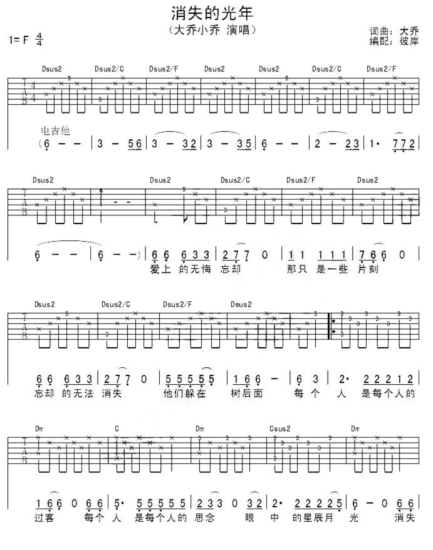 曲谱介绍: 民谣《消失的光年》,拍子:4/4;速度:60-80;选调:C