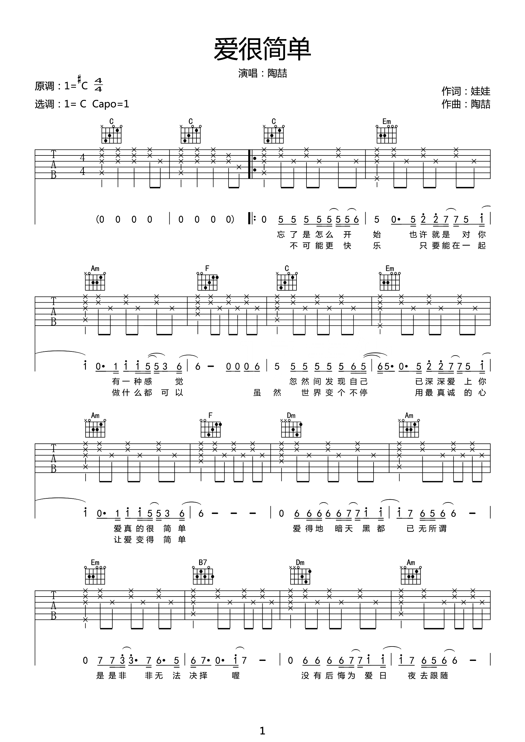 曲谱介绍: 陶喆演唱的一首歌曲,4/4拍的节奏,这首歌曲的原调为#C调,这里曲谱采用了C调指法进行编配,演唱时夹变调夹1品可回到原调,也可根据个人实际嗓音情况选择。曲谱由琴谱网更新上传,曲谱来源于网络转载,编配制谱者暂不详。这首歌旋律很好听,歌曲表达了情侣间浪漫的感情,歌手唱给听众一种放松的感受,因爱的简单,只需要真心相爱,一切都很简单,所以歌曲给我们的感觉是享受的。