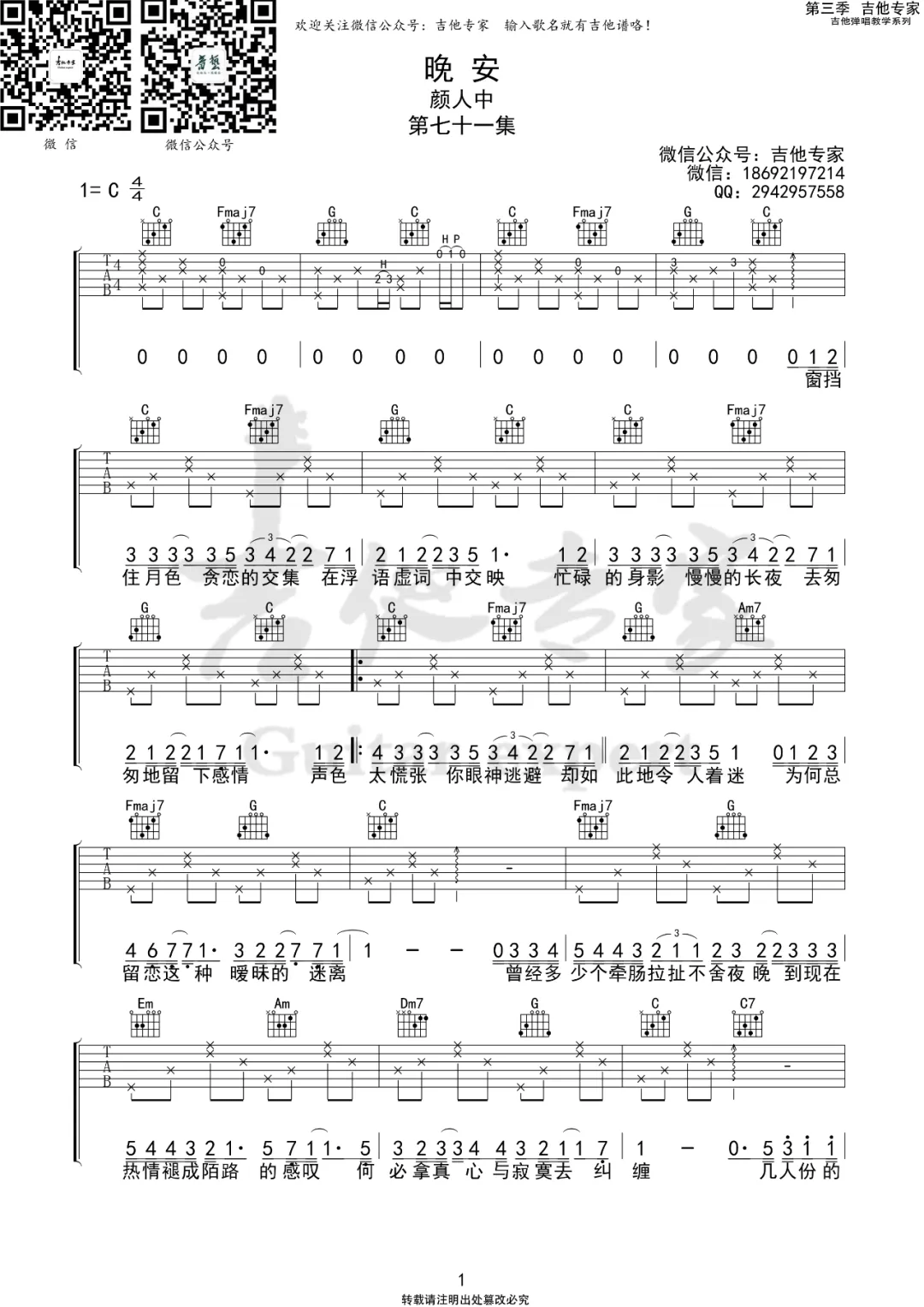 晚安吉他谱 - 颜人中 - C调吉他弹唱谱 - 原版