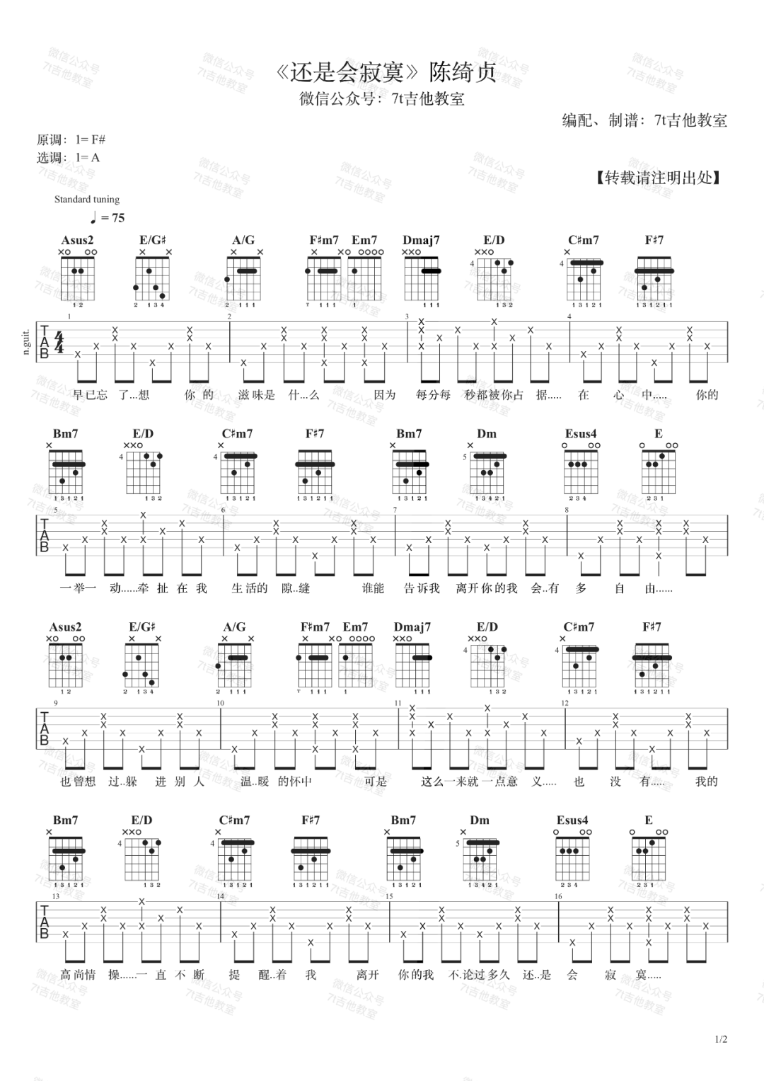 曲谱介绍: 陈绮贞演唱的一首歌曲,4/4拍的节奏,这首歌曲的原调为#F调,这里曲谱采用了A调指法进行编配,演唱时可根据个人情况选择变调夹,曲谱由琴谱网更新上传,来源于@7T吉他教室编配出品。这首歌有中文和英文歌名,两个歌名含义完全不同,分别代表她创作那首歌曲的头尾精神;歌名听起来简单,歌词意境却往往相反,所提供的想像空间充份展露她哲学性思考的一面。