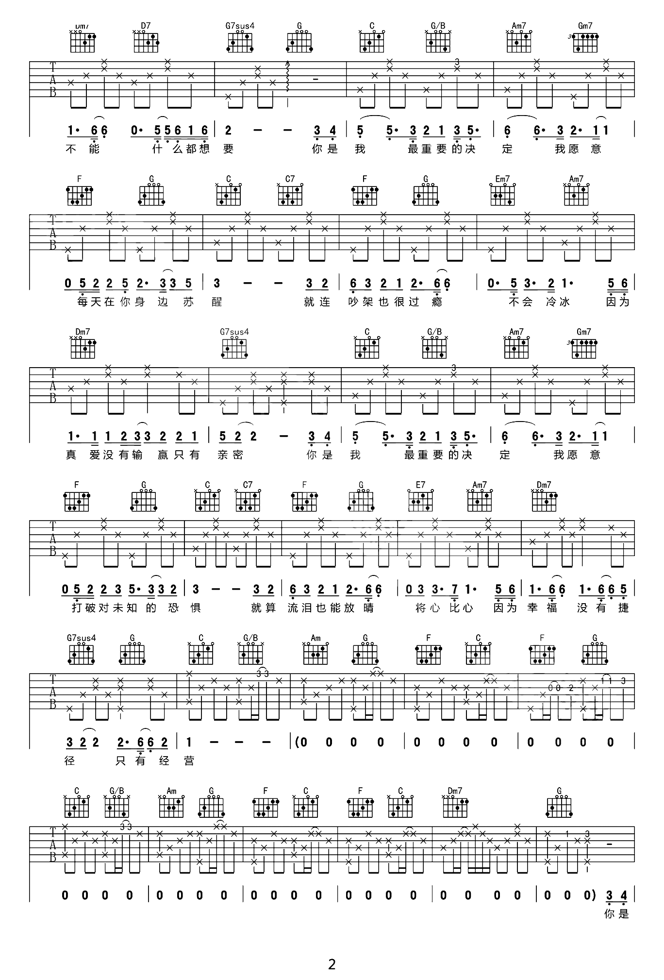 曲谱介绍: 范玮琪演唱的一首歌曲,4/4拍的节奏,这首歌曲的原调为#F调,这里曲谱采用了C调指法进行编配,演唱时夹变调夹6品可回到原调,也可根据个人实际嗓音情况选择。曲谱由琴谱网更新上传,曲谱来源于网络转载,编配制谱者暂不详。作词人姚若龙文字功夫依然很细腻很给力,再加上这首歌应时应景,作为当时准新娘范范的量身之作,“真爱没有输赢只有经营”这句金句最适合表达歌者对自己接下来人生的态度。