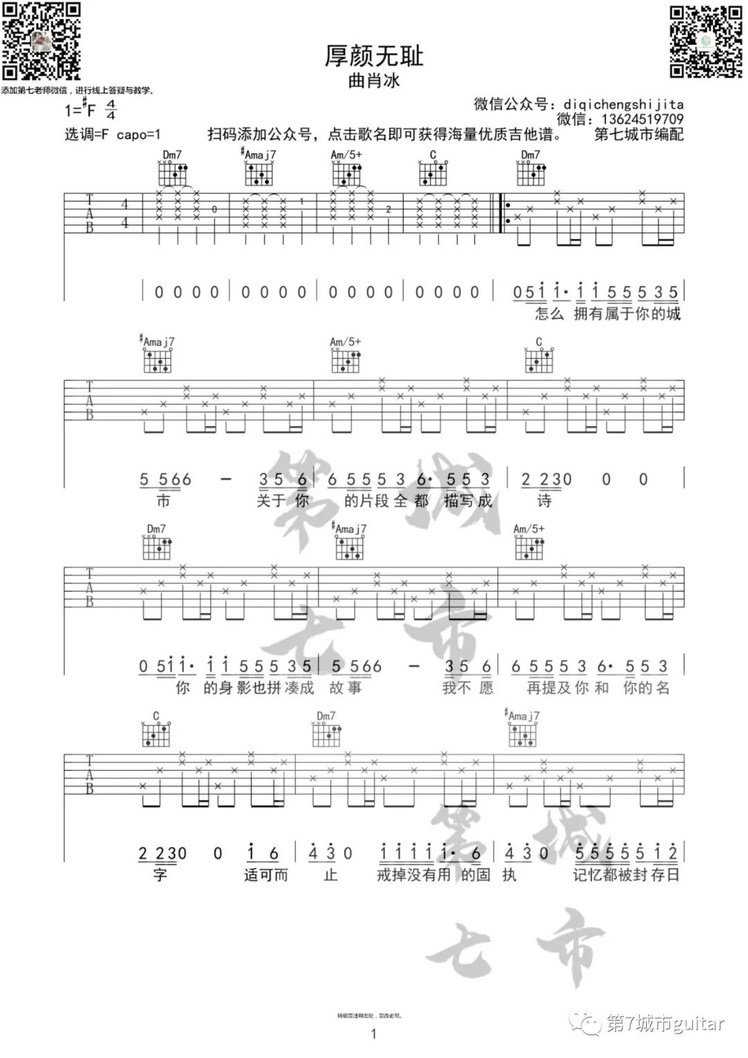 曲谱介绍: 曲肖冰演唱的一首歌曲,4/4拍的节奏,这首歌曲的原调为#F调,这里曲谱采用了F调指法进行编配,演唱时夹变调夹1品可回到原调,也可根据个人实际嗓音情况选择。曲谱由琴谱网更新上传,来源于@第七城市编配出品。从这首歌的歌词可以看出,歌曲表达对过往爱情的放手,不再让那些回忆浮现,厚颜无耻显然已不必要,取而代之的则是冰释前嫌,释怀坦然。