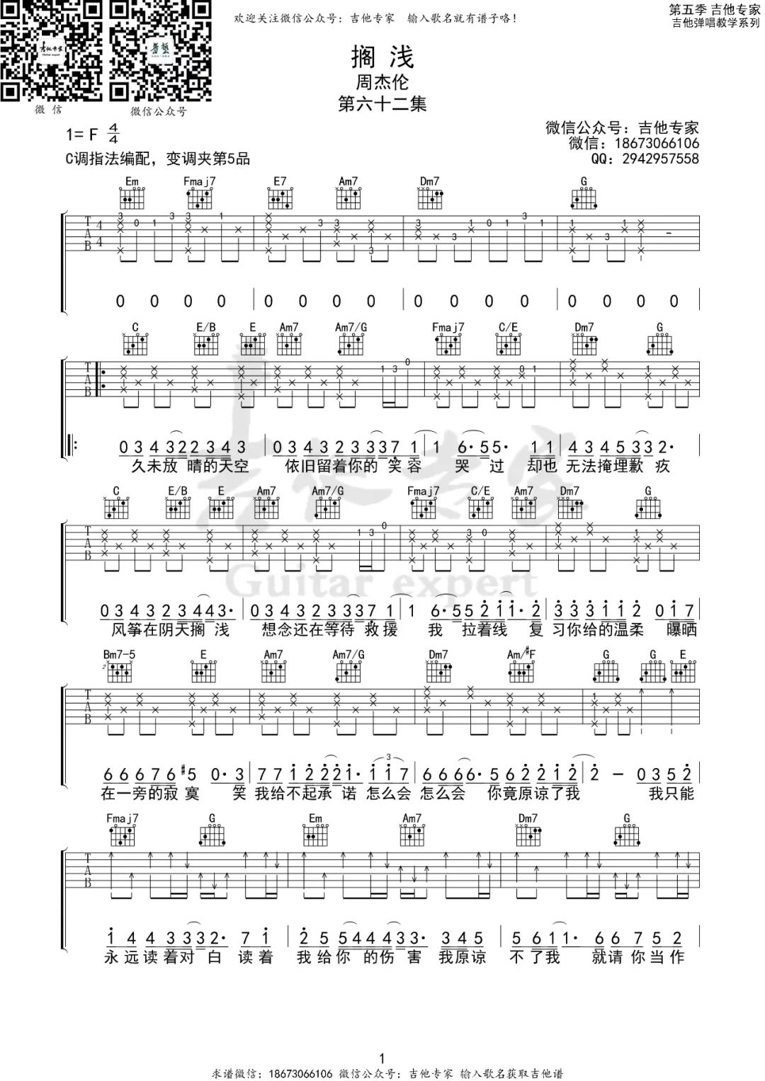 曲谱介绍: 周杰伦演唱的一首歌曲,4/4拍的节奏,这首歌曲的原调为F调,这里曲谱采用了C调指法进行编配,演唱时夹变调夹5品可回到原调,也可根据个人实际嗓音情况选择。曲谱由琴谱网更新上传,来源于@吉他专家编配出品。“风筝在阴天搁浅,想念还在等待救援”,把搁浅这个概念场景化,紧接着贴上心理的感受。弱弱的小男生受了重伤,让人心疼。钟兴民编写的弦乐依旧优秀。