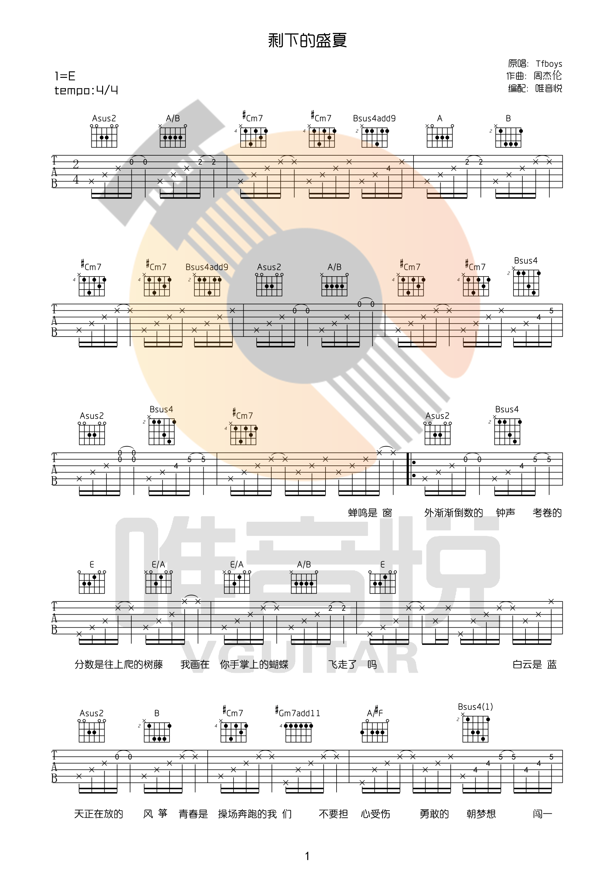 剩下的盛夏吉他谱 - TFboys - E调吉他弹唱谱 - 原版