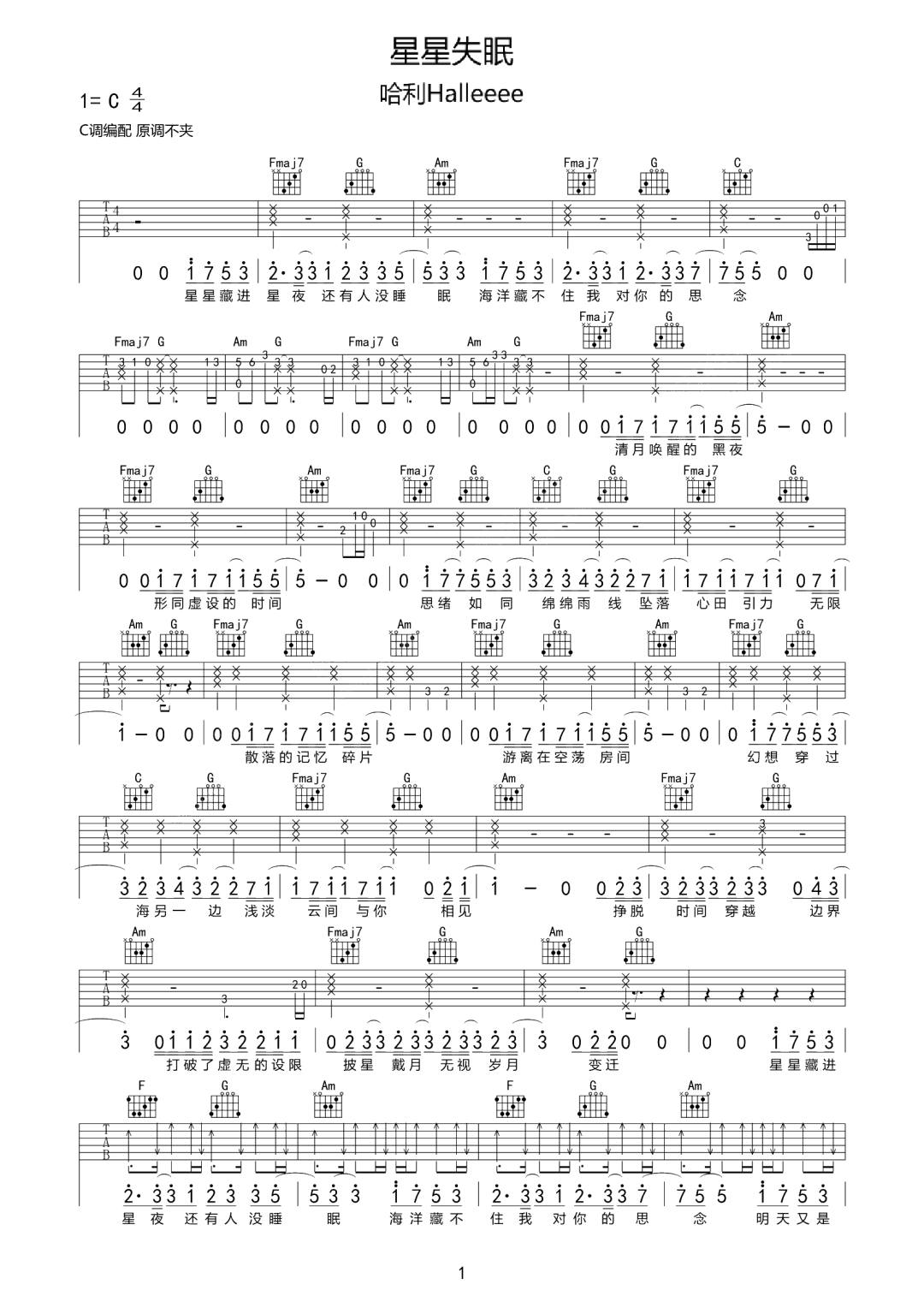 星星失眠吉他谱 - 哈利Halleeee - C调吉他弹唱谱