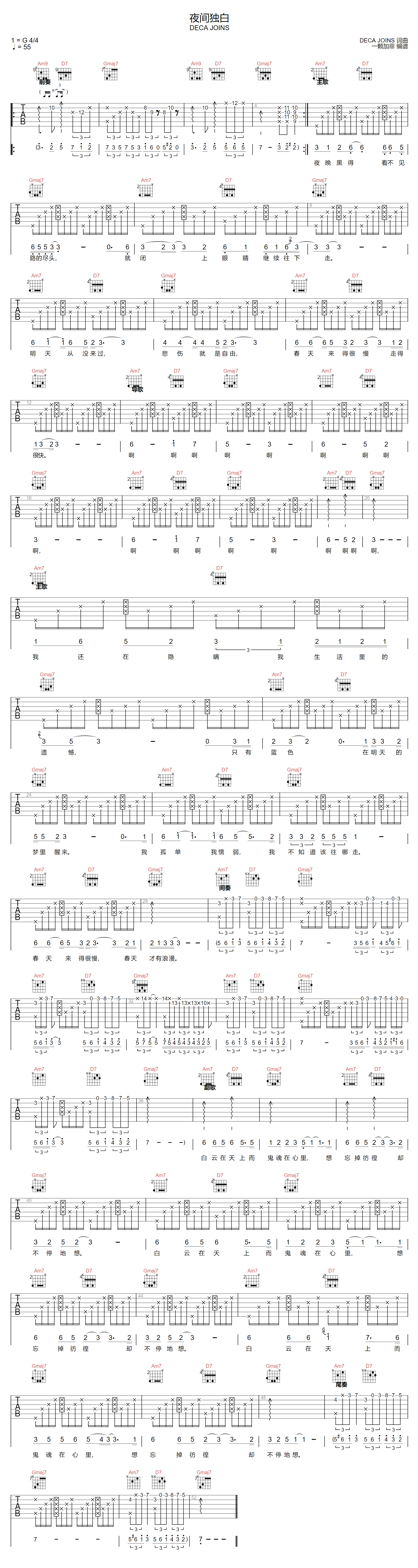 夜间独白吉他谱 - Deca - G调吉他弹唱谱 - 原版