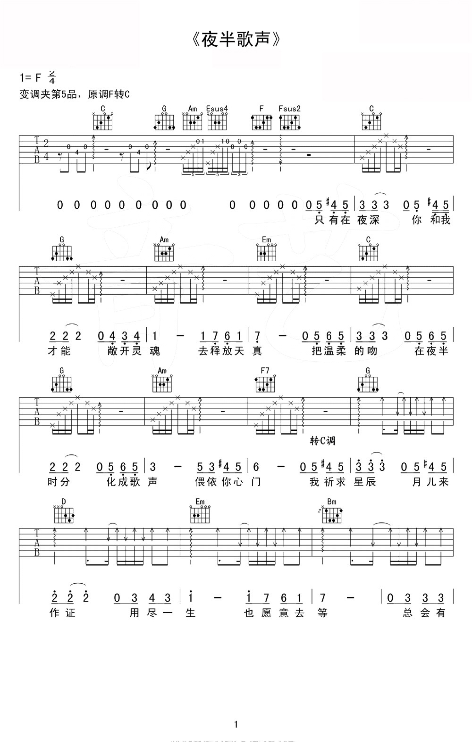 曲谱介绍: 张国荣《夜半歌声》吉他谱,原调F转C调,变调夹第五品。 “只有在夜深,我和你才能,敞开灵魂,去释放天真”,同名电影与《歌剧魅影》改编自同一个故事,却演绎出了不同的风情。不知道为什么,张国荣的那么多歌中,唯独对这首印象极其深刻,这样一首饱含深情的歌。