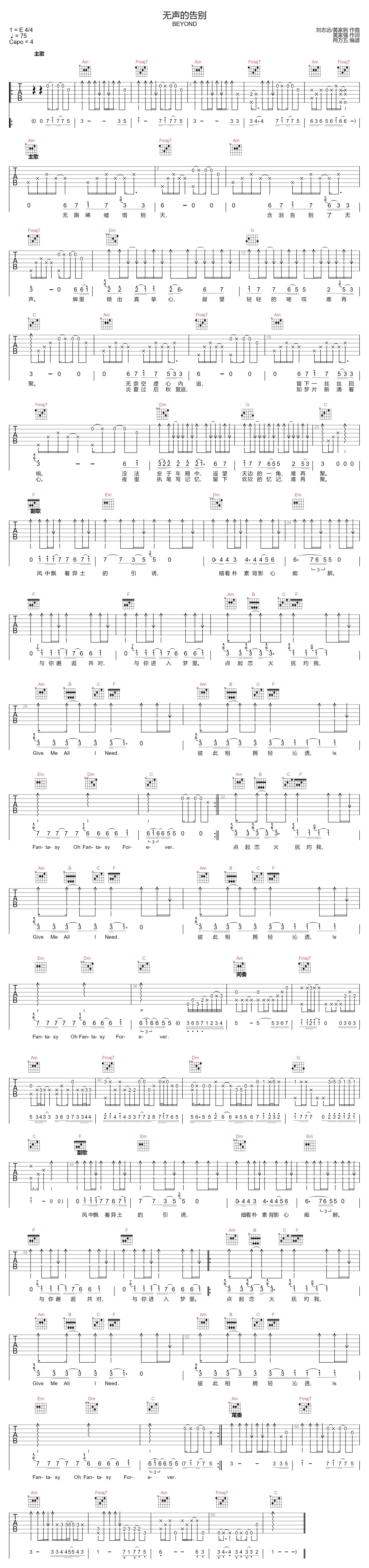 无声的告别吉他谱 - Beyond - C调吉他弹唱谱 - 原版