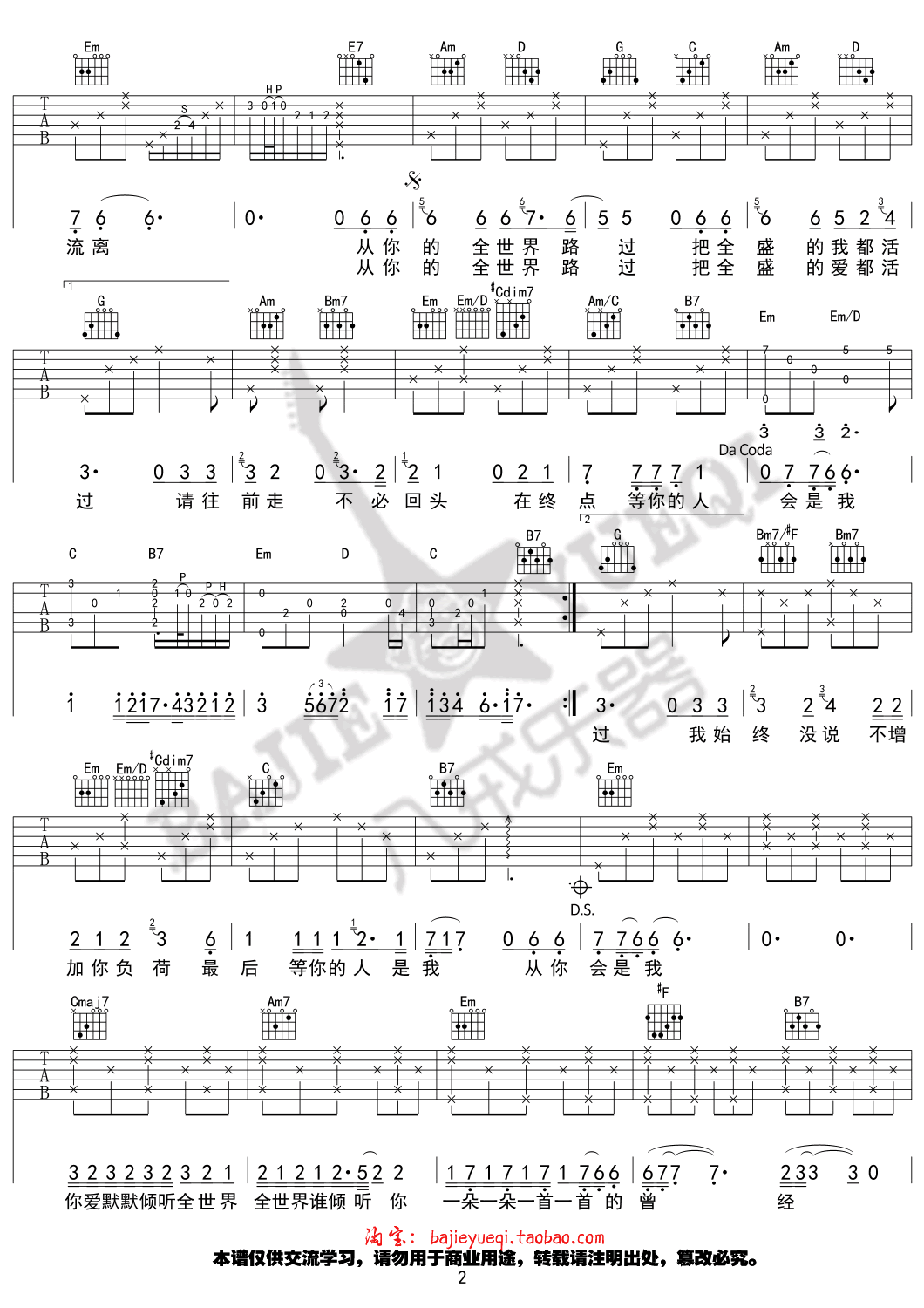 曲谱介绍: 林宥嘉演唱的一首歌曲,6/8拍的节奏,这首歌曲的原调为G调,这里曲谱采用了G调指法进行编配,演唱时可不夹变调夹,曲谱由琴谱网更新上传,来源于@八戒乐器编配出品。有时候在深夜的时候,真的感觉到自己特别孤独,感觉全世界就剩下你一个人了,特别的难受。而这首歌仿佛就是心声,我从你的全世界路过,不留一点痕迹,我只可以成为你生命中的一个过客罢了。