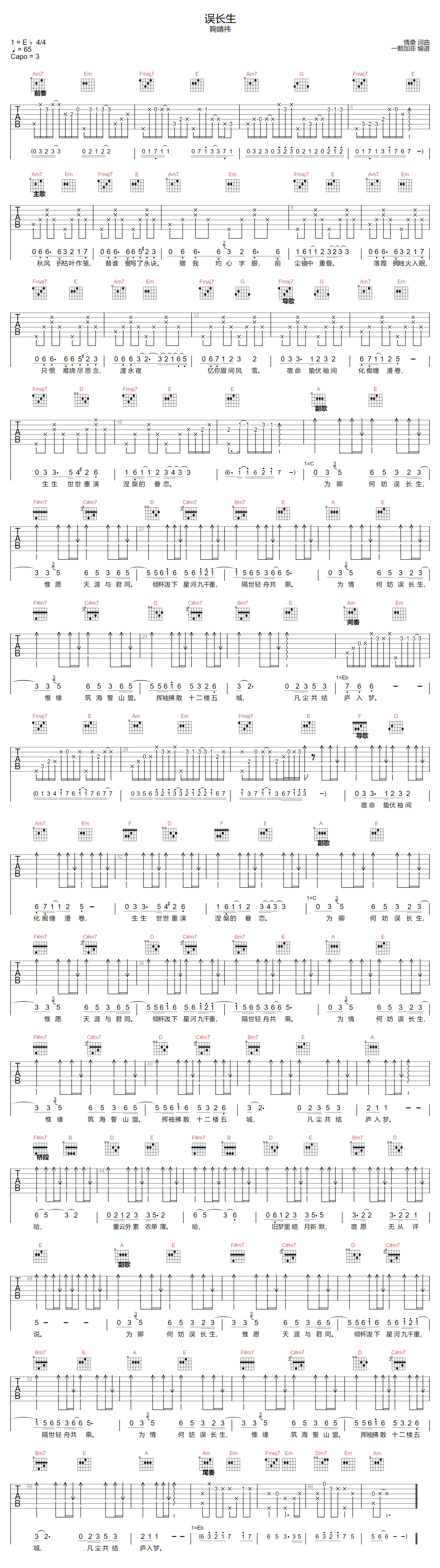 曲谱介绍: 鞠婧祎演唱的一首歌曲,4/4拍的节奏,这首歌曲的原调为降E调,这里曲谱采用了C调指法进行编配,演唱时夹变调夹3品可回到原调,也可根据个人实际嗓音情况选择。曲谱由琴谱网更新上传,来源于@一颗加菲编配出品。仍寻旧意君入梦,何妨相许误长生。三世轮回,涅槃重生,凤凰魏枝绝不甘于宿命。千帆过尽,看尽世间沧海桑田。鞠婧祎用独特的嗓音诠释《误长生》。