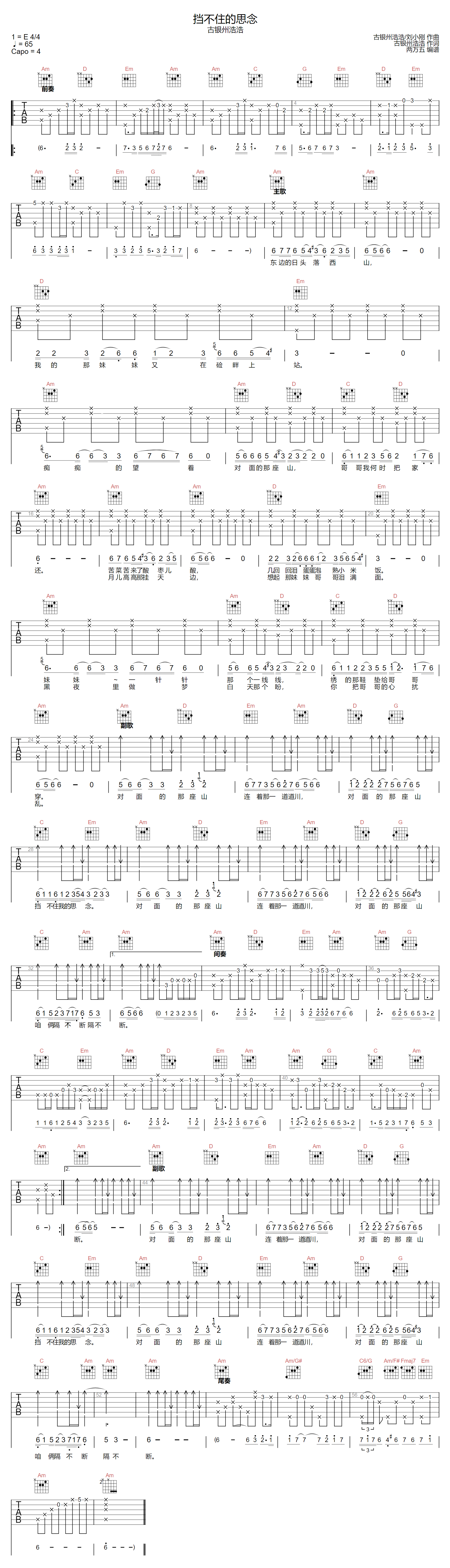 挡不住的思念吉他谱 - 古银州浩浩 - C调吉他弹唱谱 - 原版