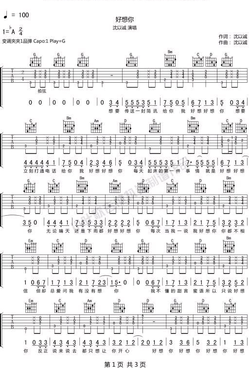 好想你吉他谱 - 沈以诚 - G调吉他弹唱谱 - 原版