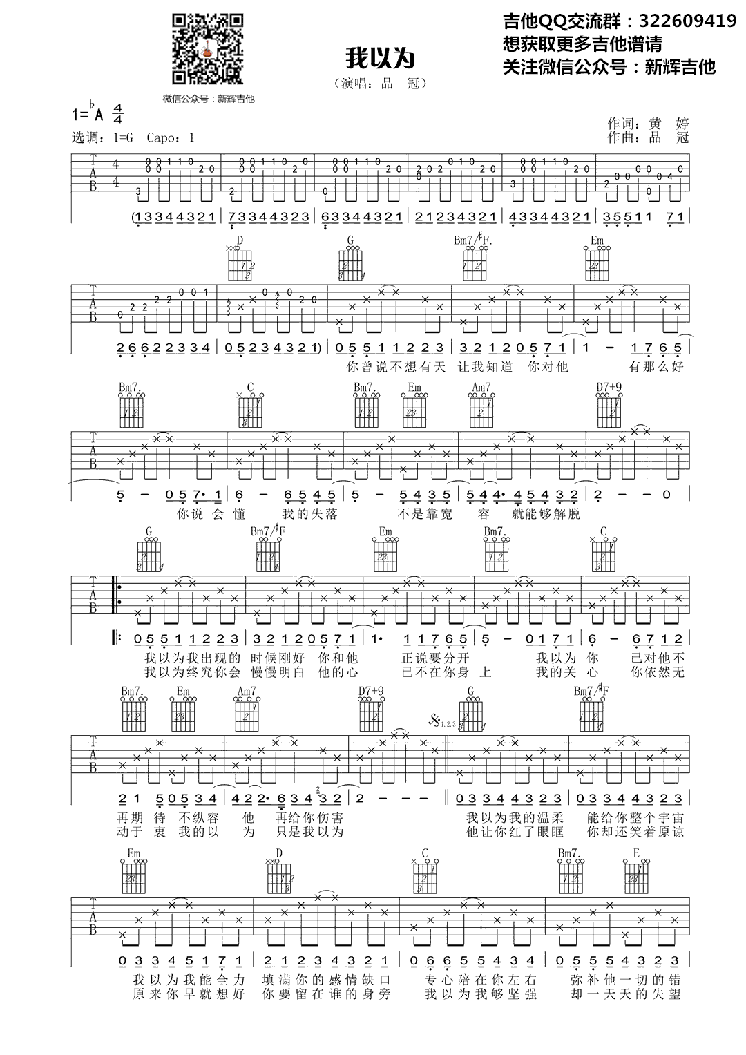 我以为吉他谱 - 品冠 - G调吉他弹唱谱 - 原版