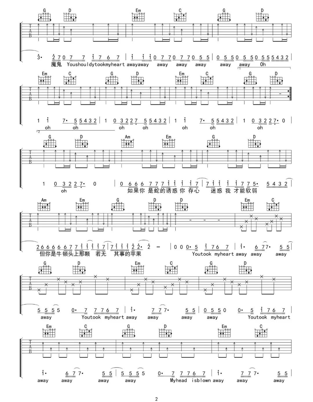 曲谱介绍: 邓紫棋演唱的一首歌曲,4/4拍的节奏,这首歌曲的原调为降B调,这里曲谱采用了G调指法进行编配,演唱时夹变调夹3品可回到原调,也可根据个人实际嗓音情况选择。曲谱由琴谱网更新上传,来源于@吴先生TAB编配出品。“如果你是蛇的诱惑,你存心迷惑,我才能软弱;但你是牛顿头上那颗若无其事的苹果”,当魔鬼来自天堂,你才会知道什么是一念之间,进与退的取舍。