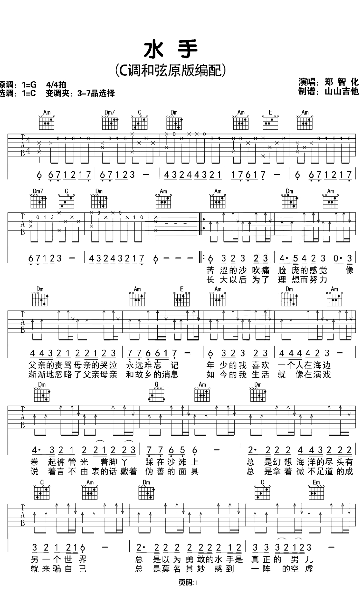 曲谱介绍: 郑智化《水手》吉他谱_C调吉他弹唱谱