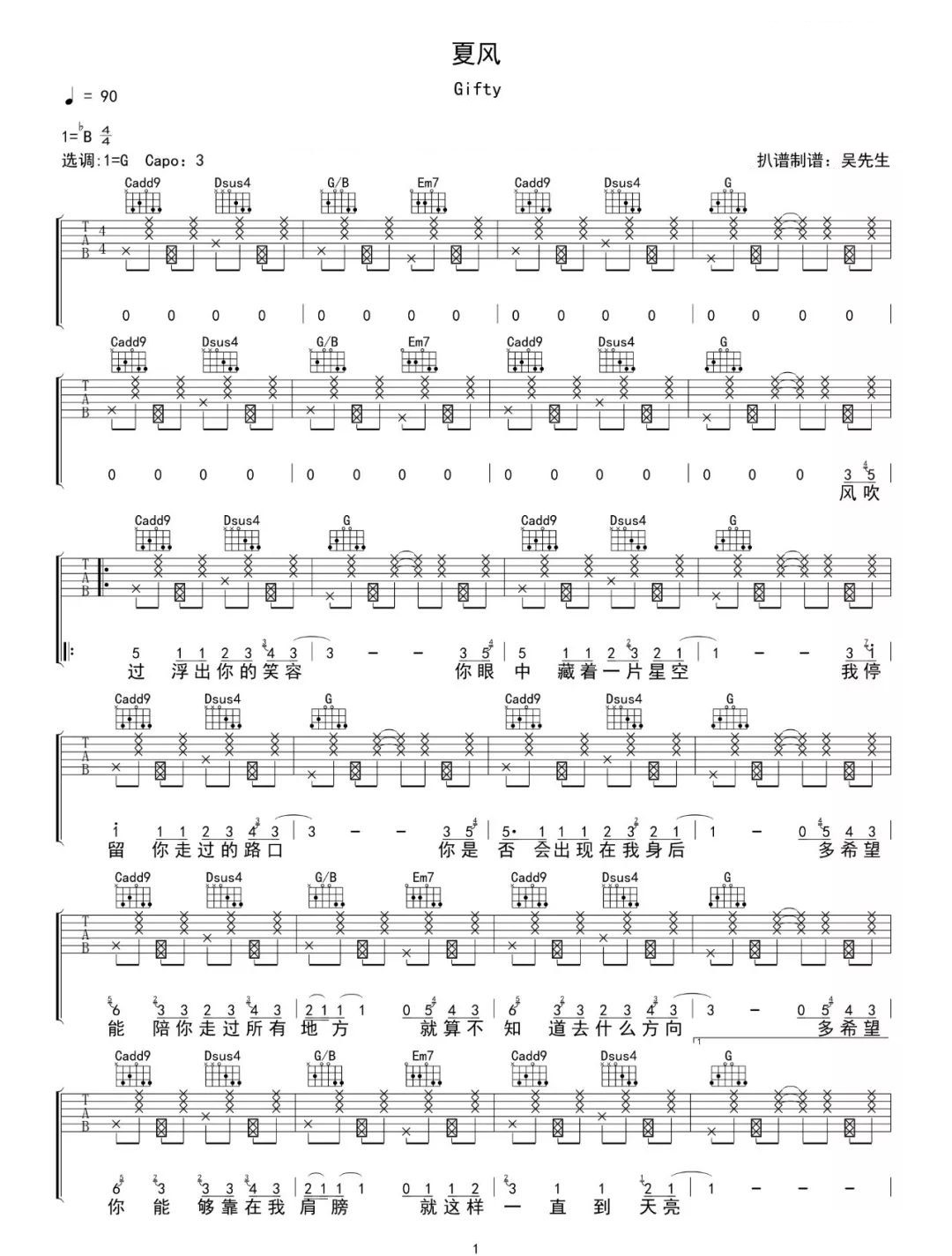 夏风吉他谱 - Gifty - C调吉他弹唱谱 - 原版