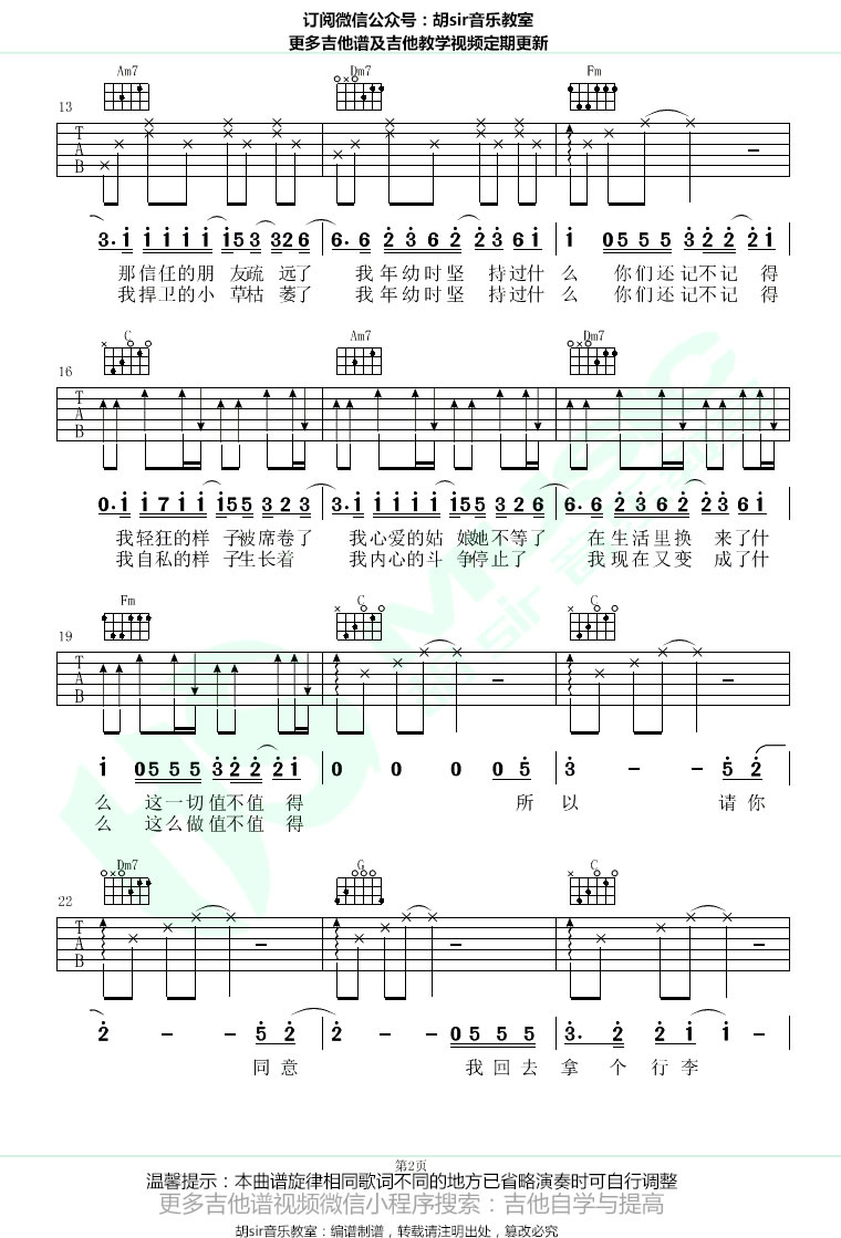 曲谱介绍: 薛之谦演唱的一首歌曲,4/4拍的节奏,这首歌曲的原调为C调,这里曲谱采用了C调指法进行编配,演唱时可不夹变调夹,曲谱由琴谱网更新上传,来源于@胡sir吉他编配出品。薛之谦和岳云鹏共同演唱的歌曲,这首歌的歌词写的很深刻,令人深思,如同面对自己内心的独白,因为许多外在因素我们可能失去了自己。