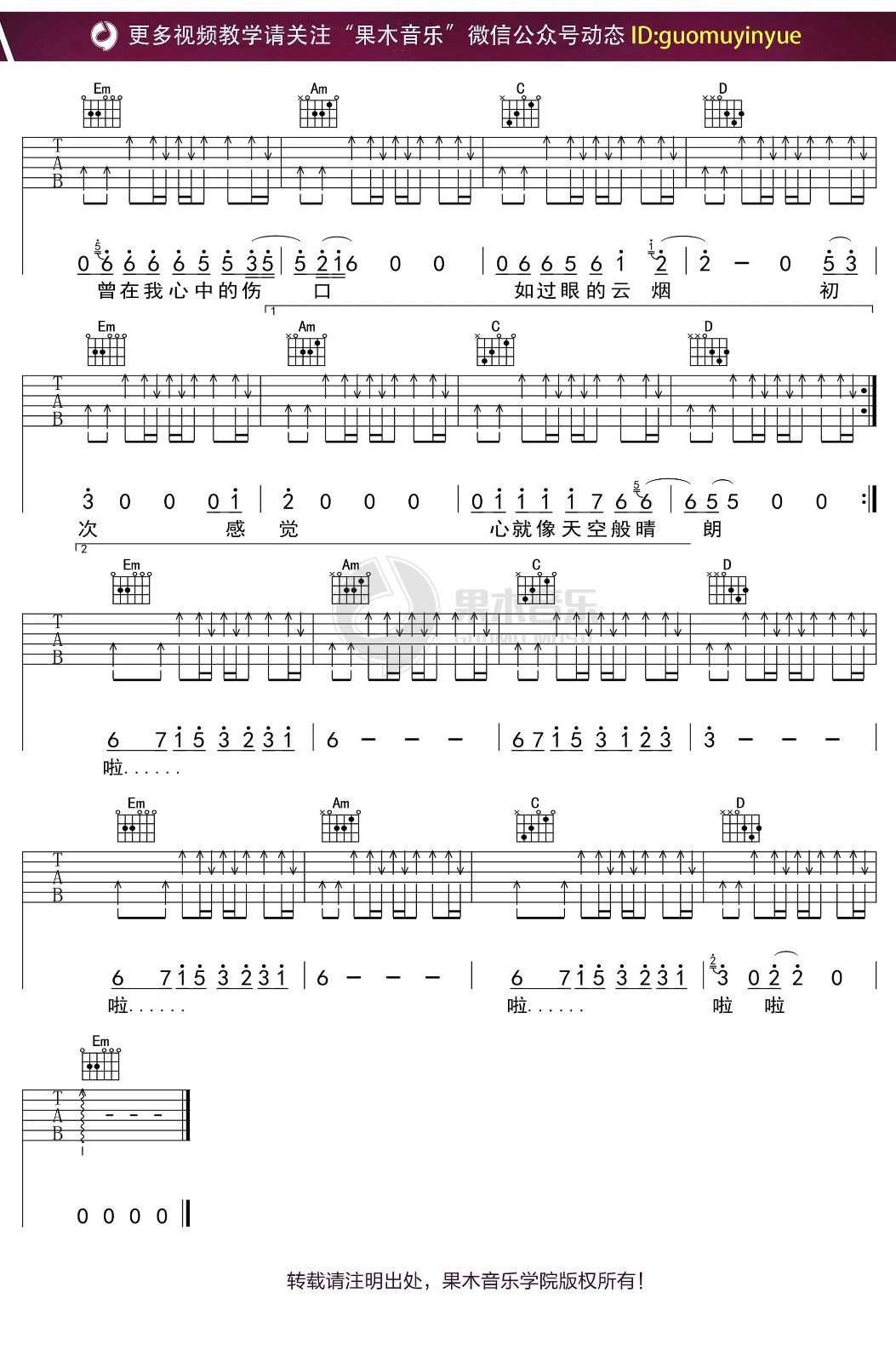 曲谱介绍: 许巍演唱的一首歌曲,4/4拍的节奏,这首歌曲的原调为G调,这里曲谱采用了G调指法进行编配,演唱时可不夹变调夹,曲谱由琴谱网更新上传,来源于@果木音乐编配出品。这首歌是许巍给老狼写的一首歌曲,后来许巍重新作曲并演唱。这首歌作为许巍的一首转折之作,代表了许巍自身对于生活与人生的一种态度和感悟。
