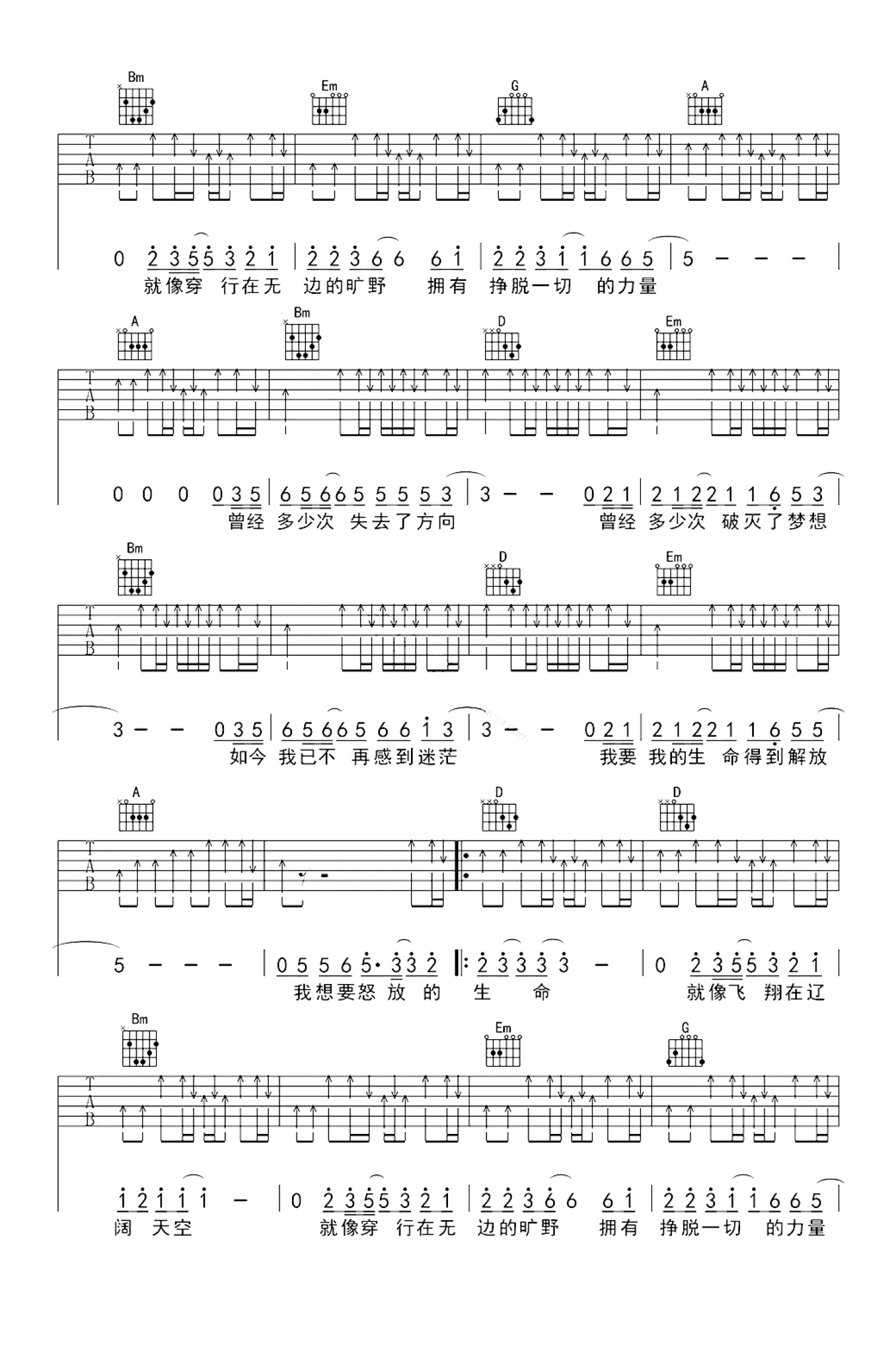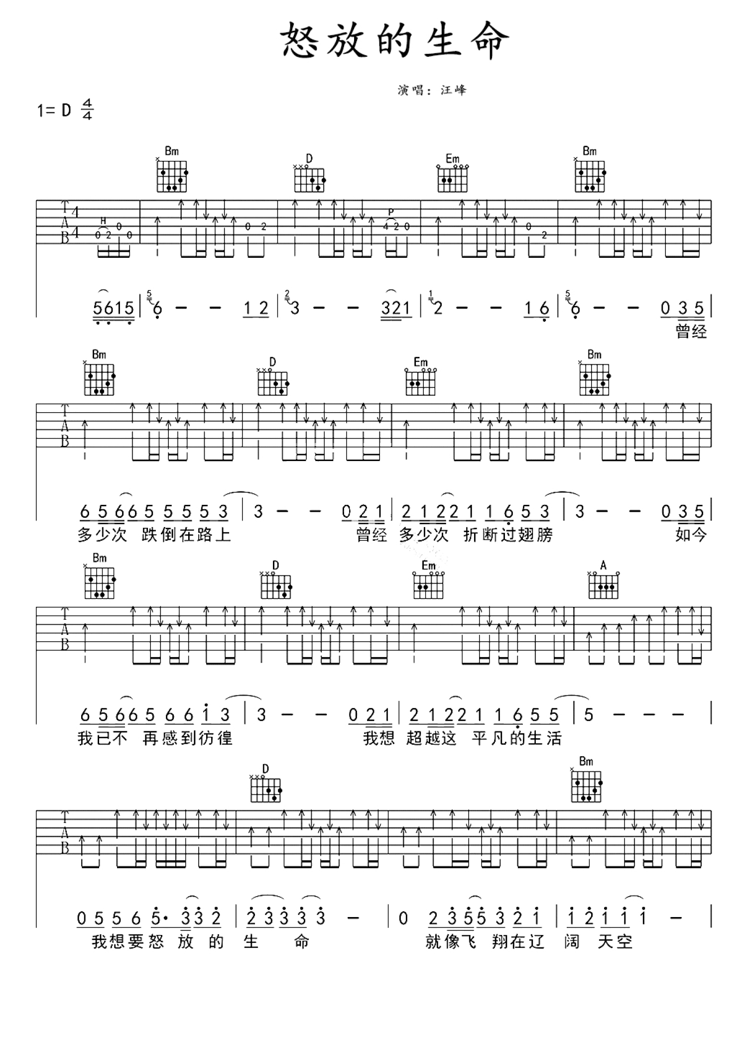 曲谱介绍: 汪峰《怒放的生命》吉他谱_D调吉他弹唱谱