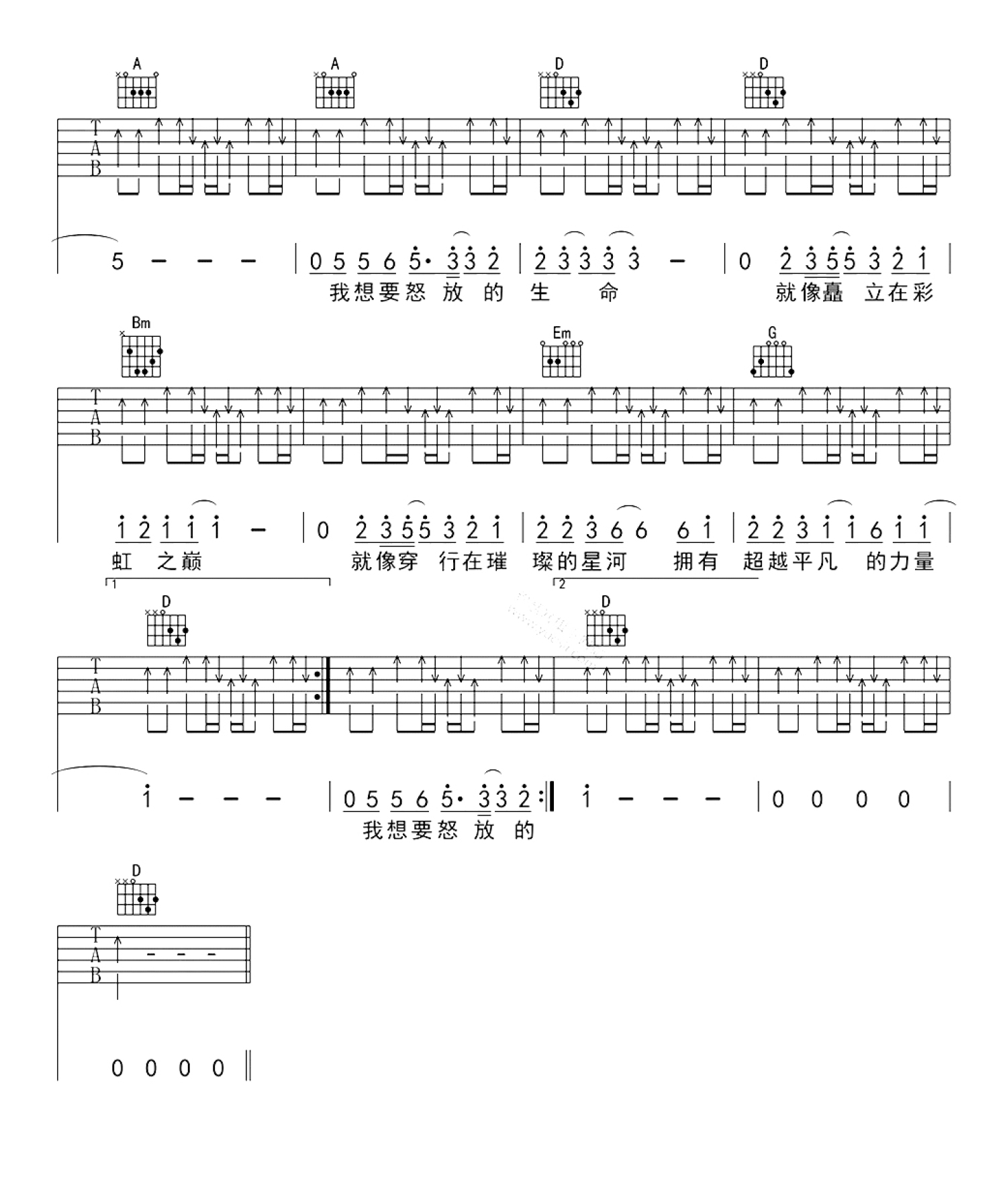 怒放的生命吉他谱 - 汪峰 - D调吉他弹唱谱