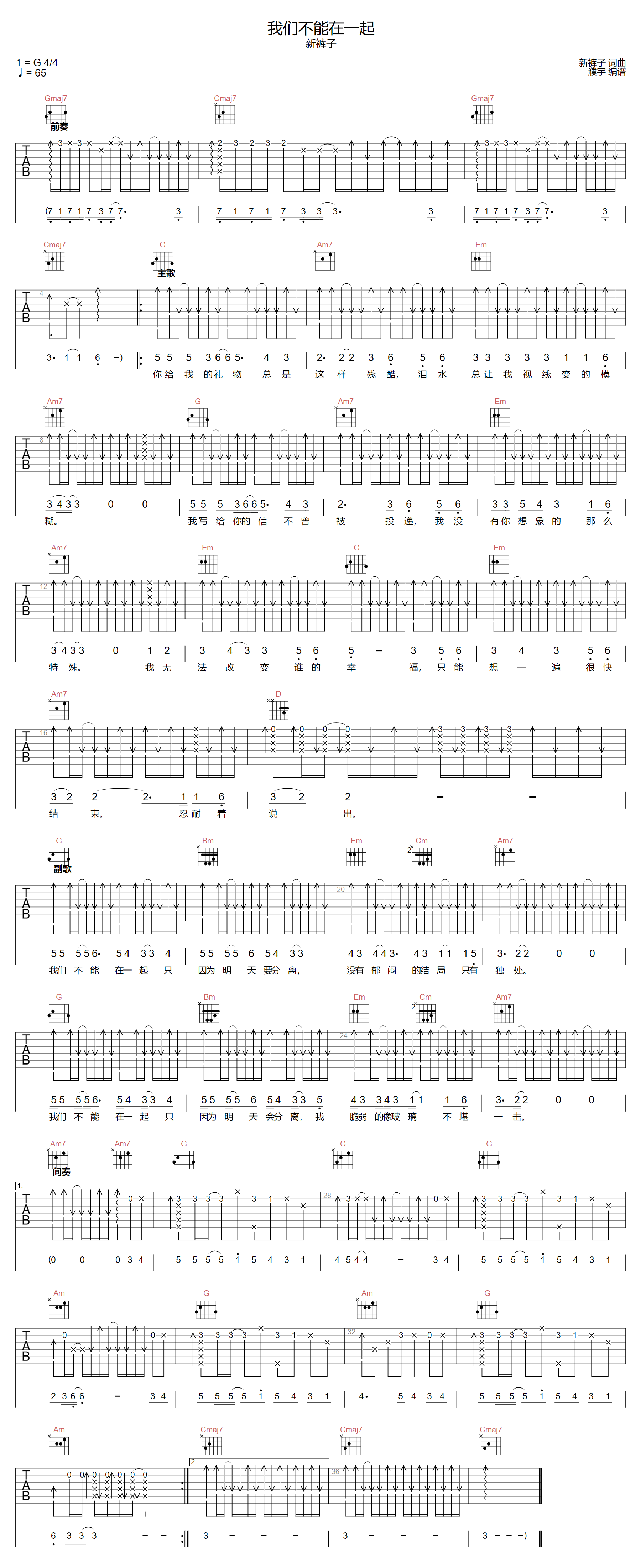 我们不能在一起吉他谱 - 新裤子 - G调吉他弹唱谱