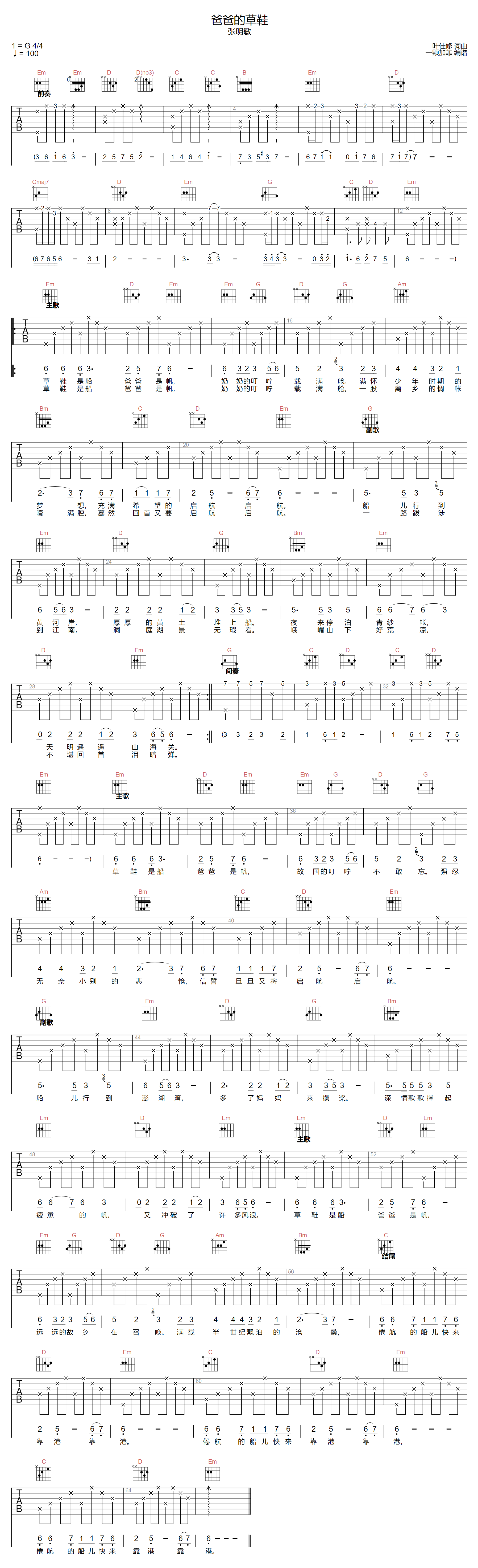 爸爸的草鞋吉他谱 - 张明敏 - G调吉他弹唱谱 - 原版