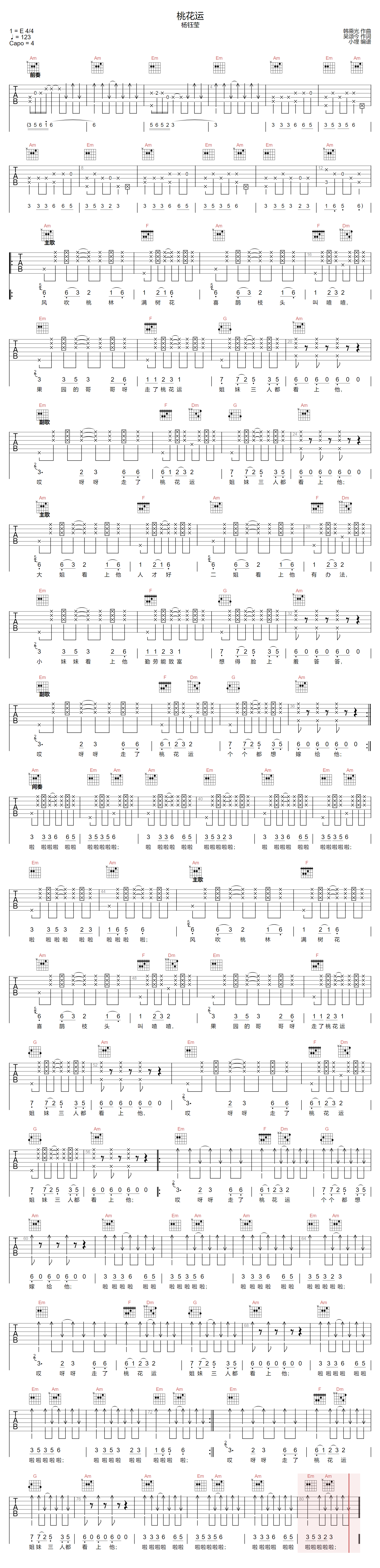曲谱介绍: 杨钰莹演唱的一首歌曲,4/4拍的节奏,这首歌曲的原调为E调,这里曲谱采用了C调指法进行编配,演唱时夹变调夹4品可回到原调,也可根据个人实际嗓音情况选择。曲谱由琴谱网更新上传,来源于@小埋编配出品。“风吹桃林满树花,喜鹊枝头叫喳喳,果园的哥哥呀走了桃花运,姐妹三人都看上他,哎呀呀走了桃花运。”