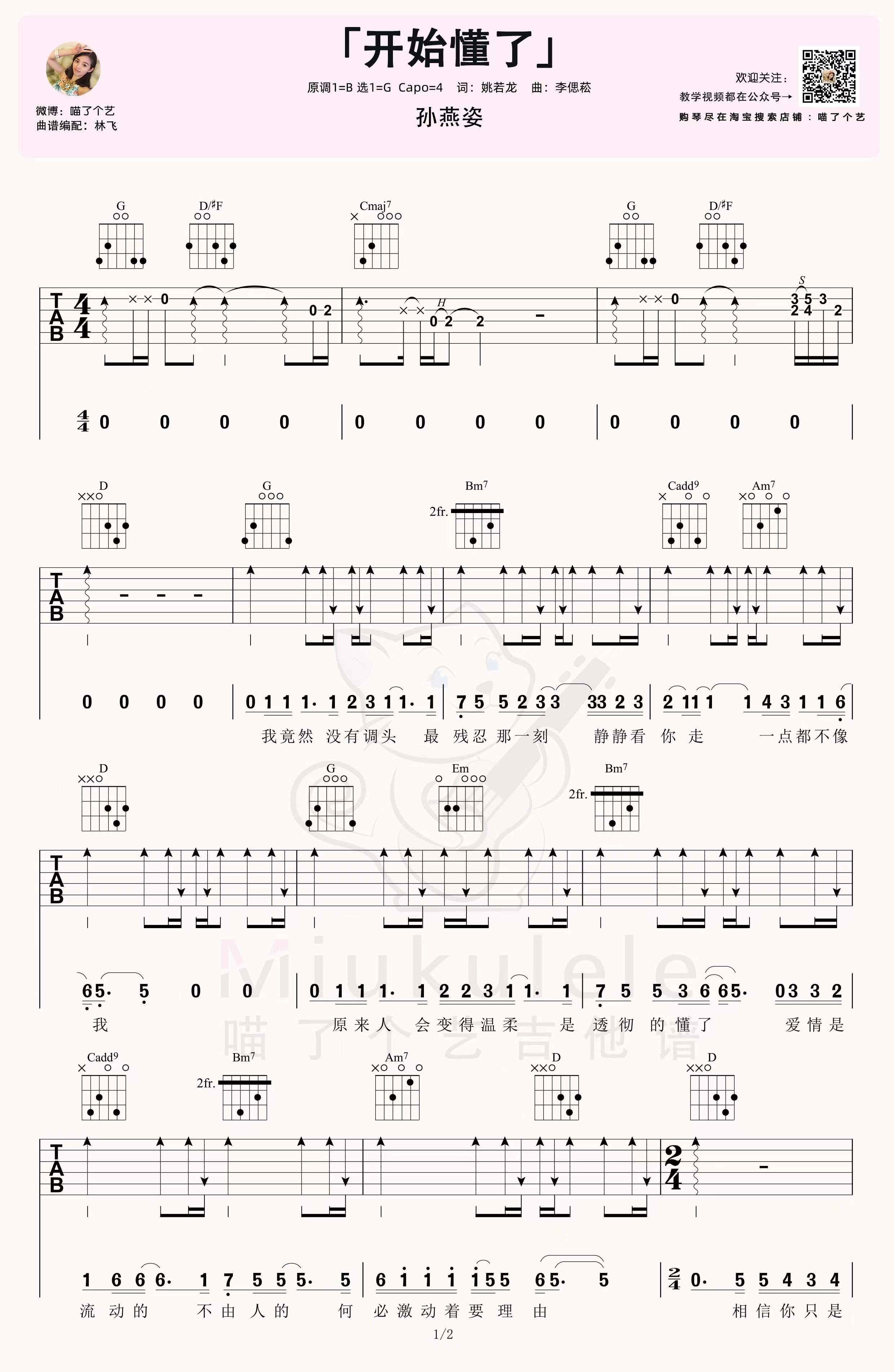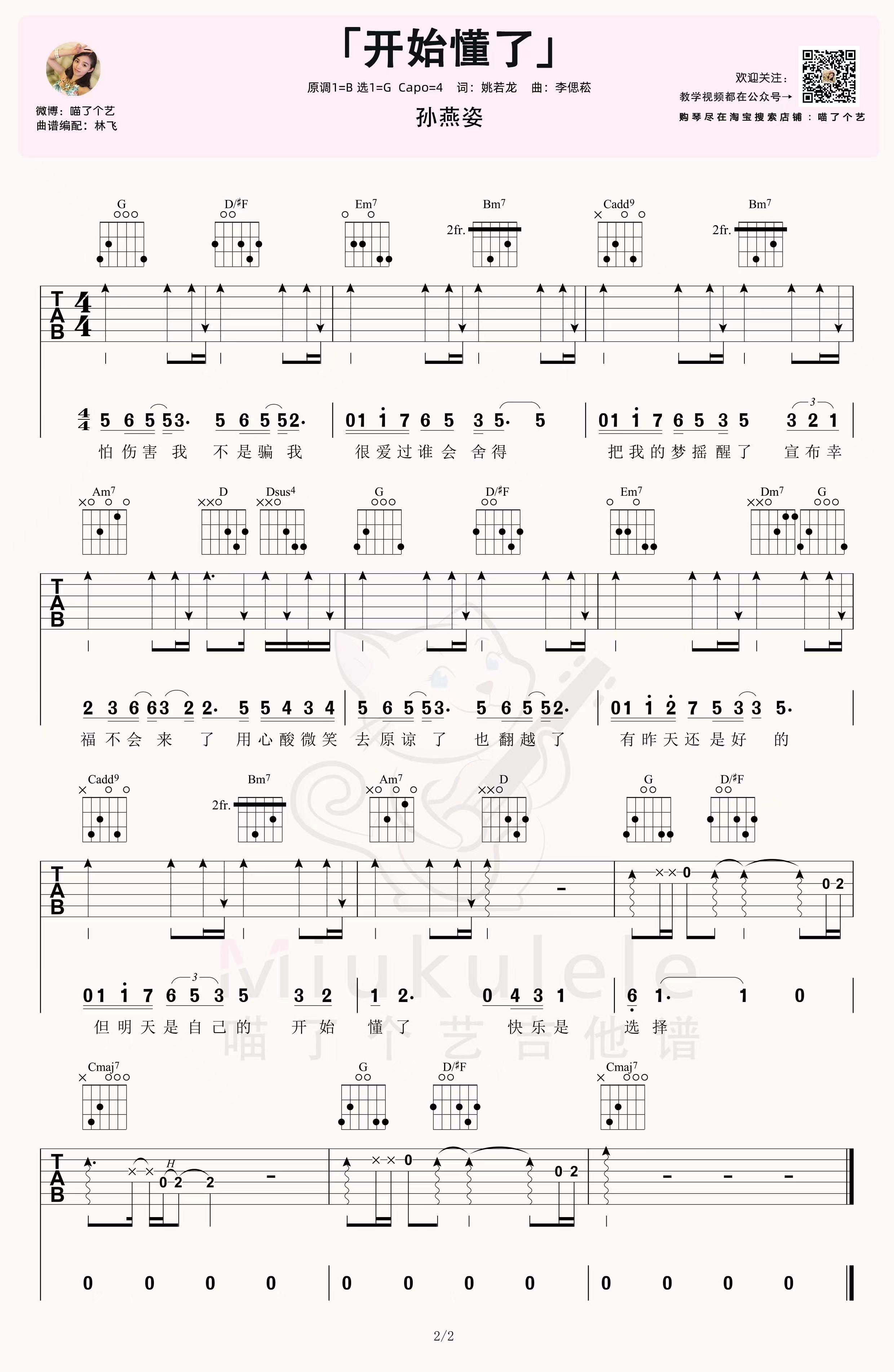 曲谱介绍: 孙燕姿《开始懂了》,一首每个人必须经历的情歌。原来人会变得温柔,是透彻的懂了,似乎在每个人第一次失恋时,重现当日的场景、画面、对白。总相信一刀两断是种解脱,谁知抽刀断水水更流。开始懂了吉他谱,G调编配版吉他弹唱谱,附教学讲解视频。歌曲整体主要用了一种扫弦的节奏型,个别和弦需要多多练习,演奏变调夹夹第四品。演示视频戳:孙燕姿《开始懂了》吉他弹唱翻唱 By喵了个艺
