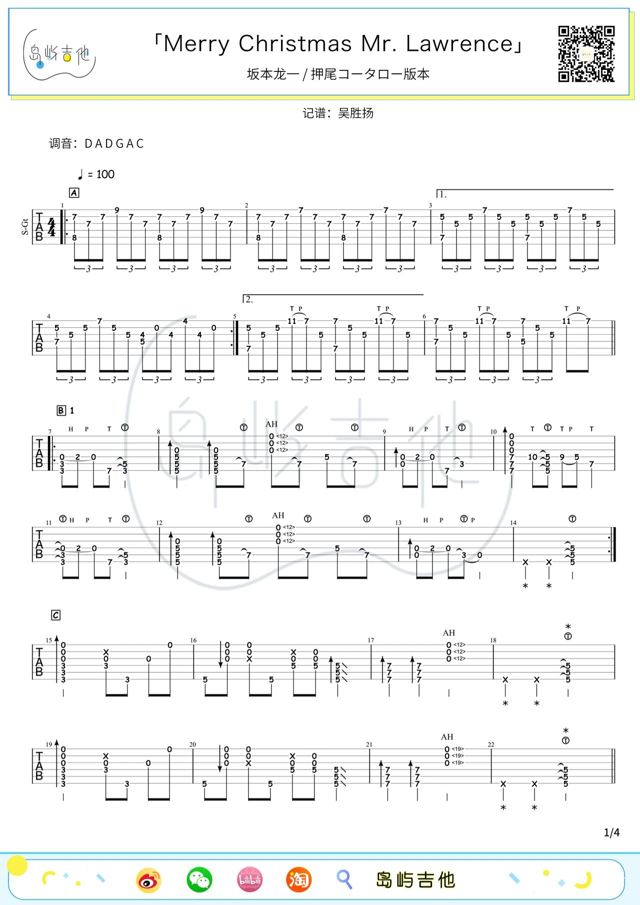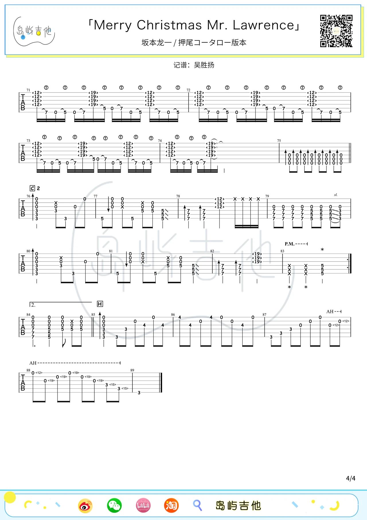 曲谱介绍: Merry Christmas Mr.Lawrence吉他谱,指弹风格版吉他六线谱,来自岛屿吉编配制谱。这首曲子旋律简单而清澈,美得让人心碎落泪。虽没有歌词,却能让人从中听见许多故事,有种神奇的魔力,能够让人平静下来、治愈不安。无论循环多久都不会觉得腻,思绪就这样跟着旋律飘荡。