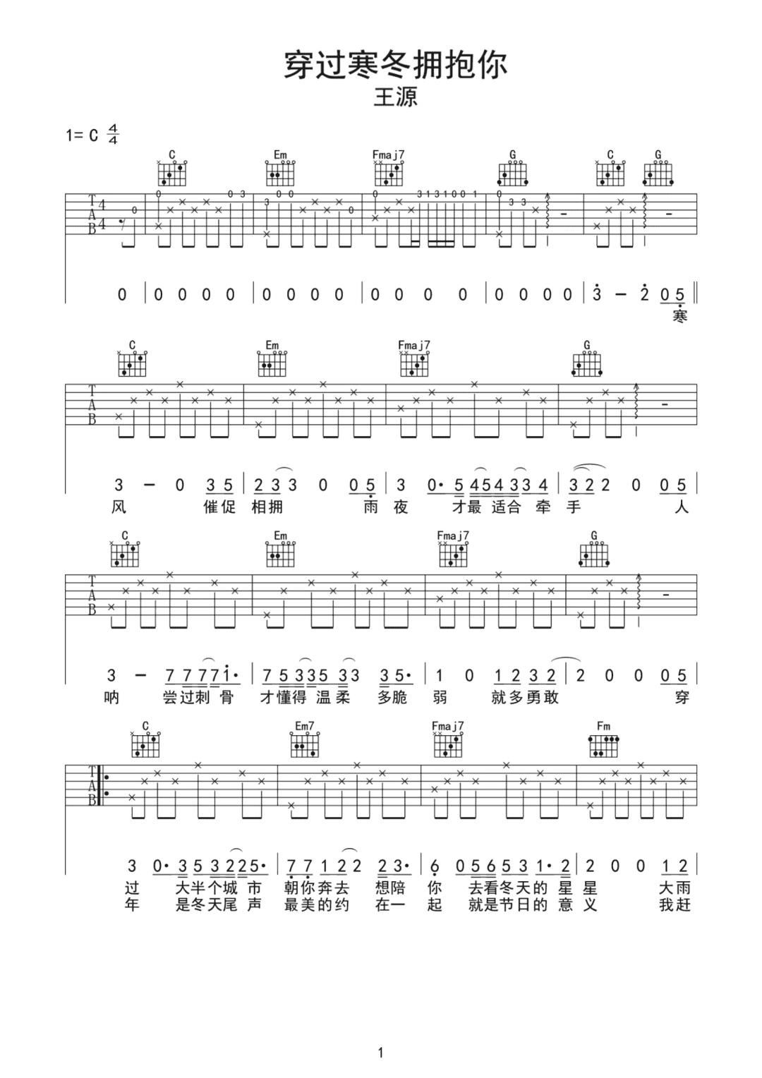 穿过寒冬拥抱你吉他谱 - 王源 - C调吉他弹唱谱 - 原版