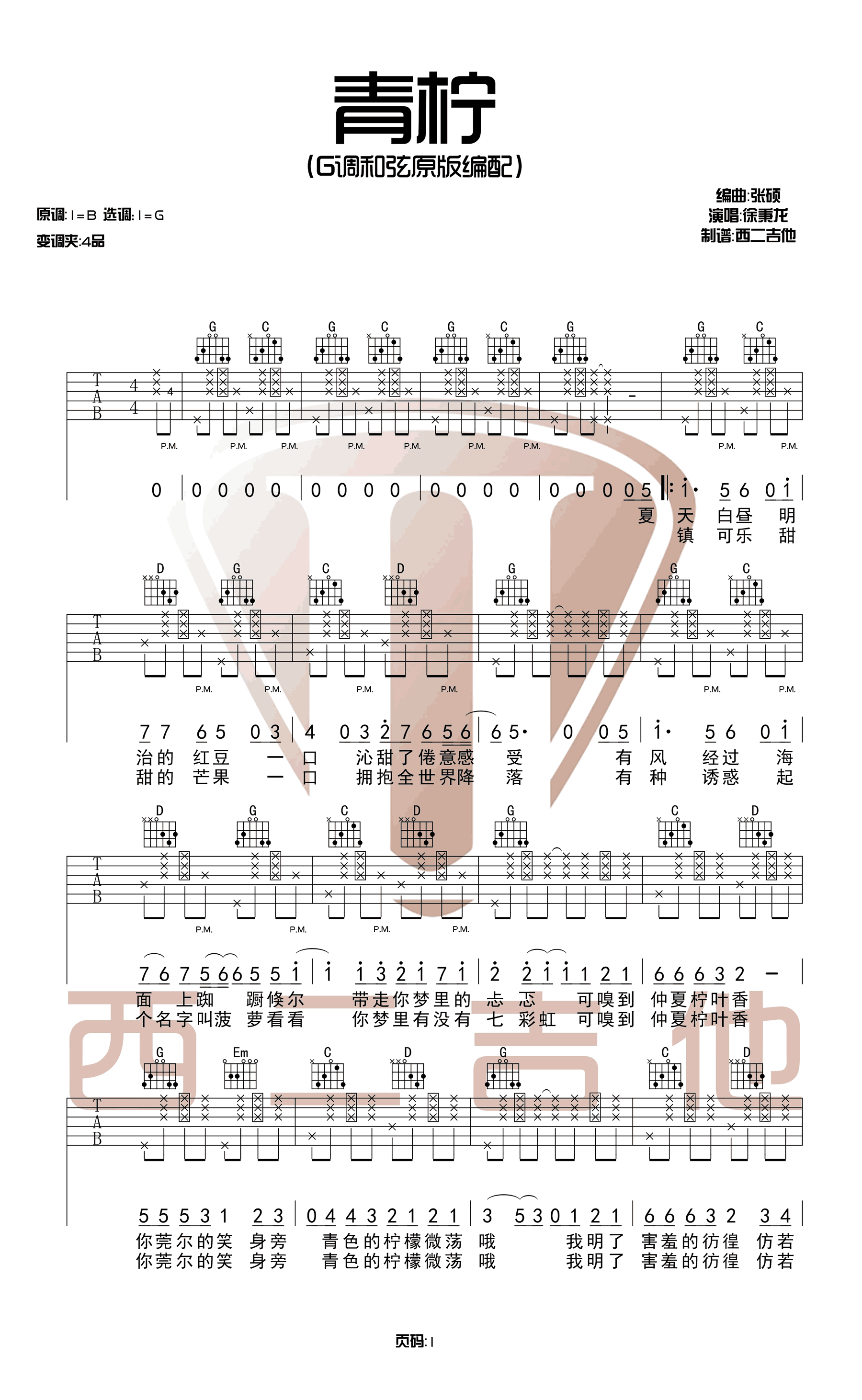 青柠吉他谱 - 徐秉龙/桃十五 - G调吉他弹唱谱