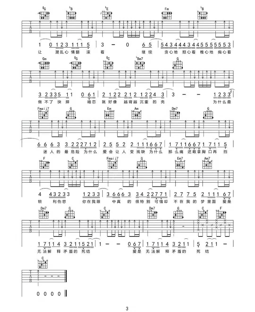 曲谱介绍: 尚士达演唱的一首歌曲,4/4拍的节奏,这首歌曲的原调为降B调,这里曲谱采用了G调指法进行编配,演唱时夹变调夹3品可回到原调,也可根据个人实际嗓音情况选择。曲谱由琴谱网更新上传,曲谱来源于网络转载,编配制谱者暂不详。歌里刻画了三角恋的关系,有来自第三方的不甘、矛盾心理,也有来自爱情里的犹豫,确实是一首感情很丰富的歌曲。